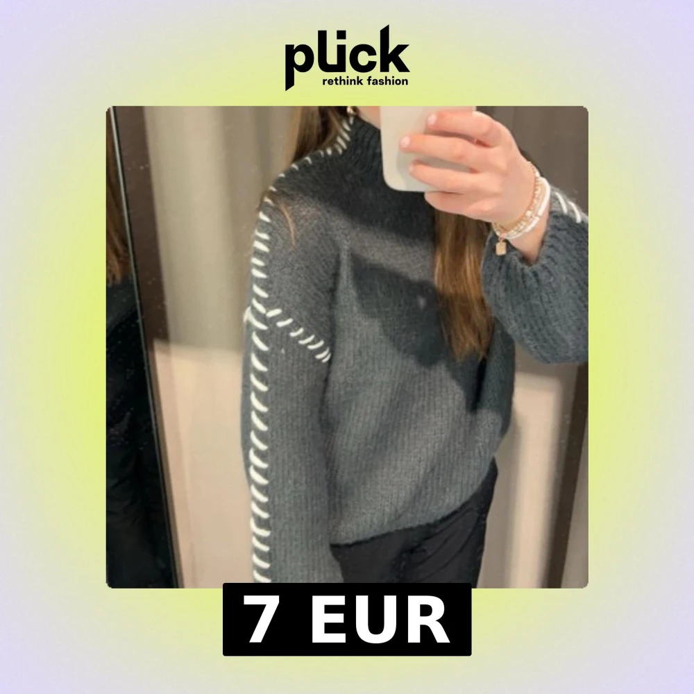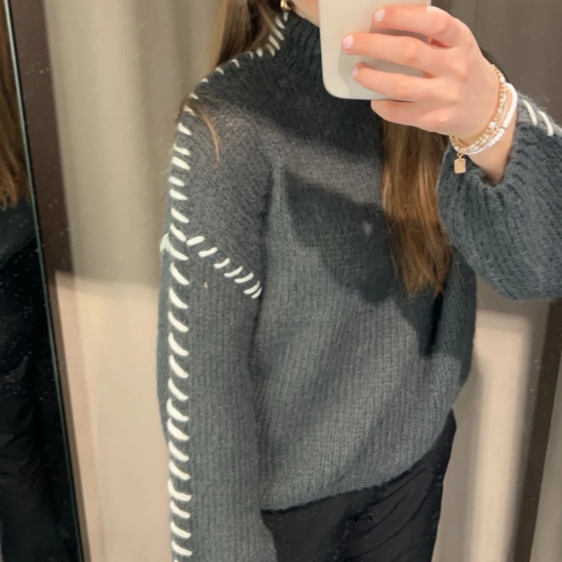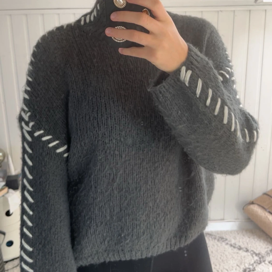 Mysig grå stickad tröja från Vila med vita dekorativa detaljer längs ärmar och axlar. Tröjan har en hög hals och lång ärm, perfekt för kyliga dagar. Den har en loose fit och känns både trendig och bekväm.