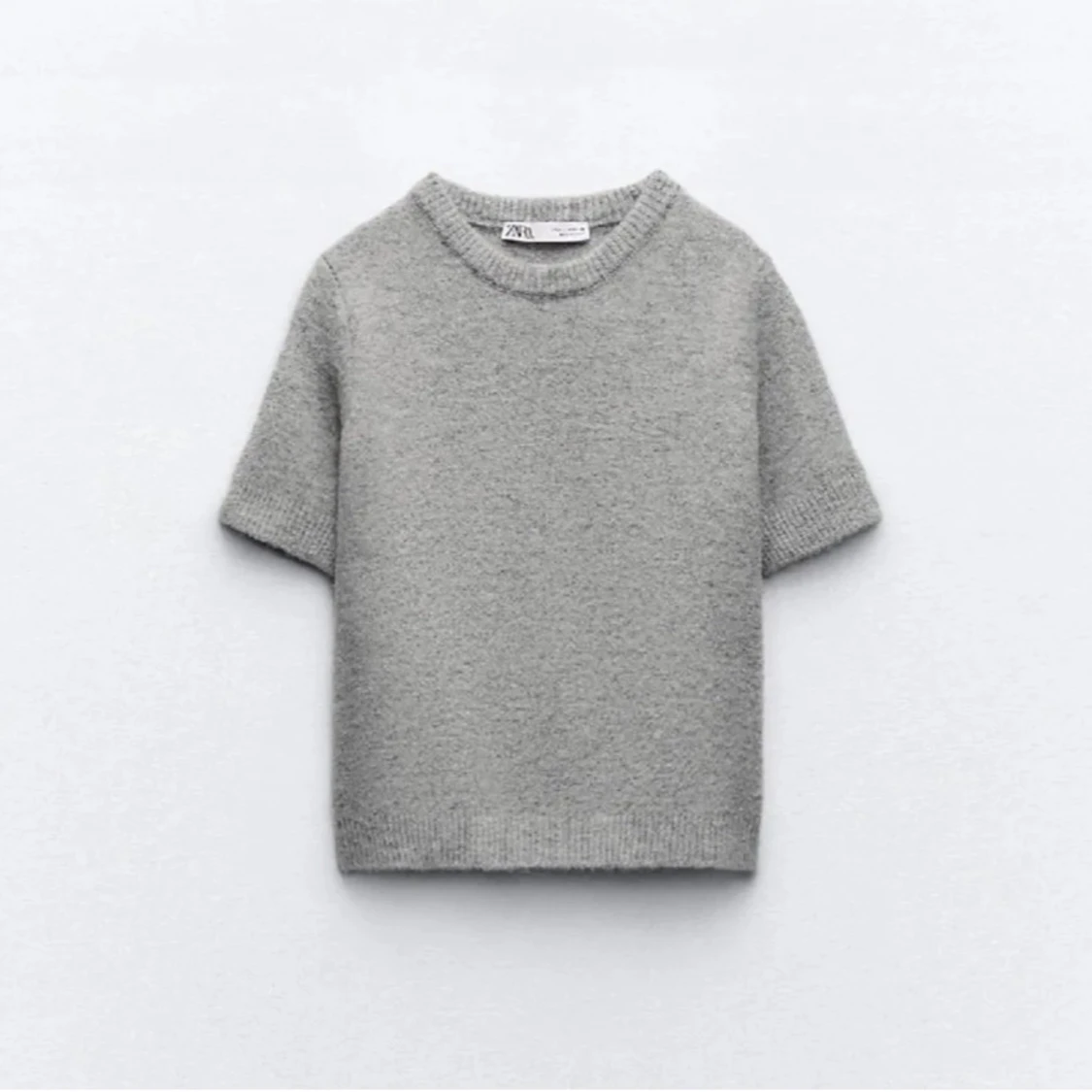 Säljer en stilren grå stickad tröja från Zara. Tröjan har korta ärmar och en rund halsringning, perfekt för en avslappnad look. Den är mjuk och bekväm, idealisk för både vardag och lite kyligare dagar.