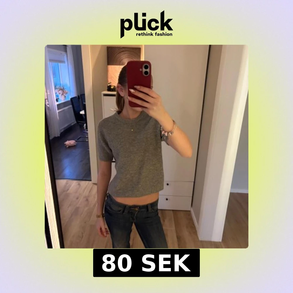 Superfin grå stickad tröja från Zara med kort ärm och rund hals. Tröjan är croppad och har en enkel, stilren look som passar perfekt till jeans eller kjol. Mjuk och skön, perfekt för lager-på-lager under hösten och våren. I storlek S