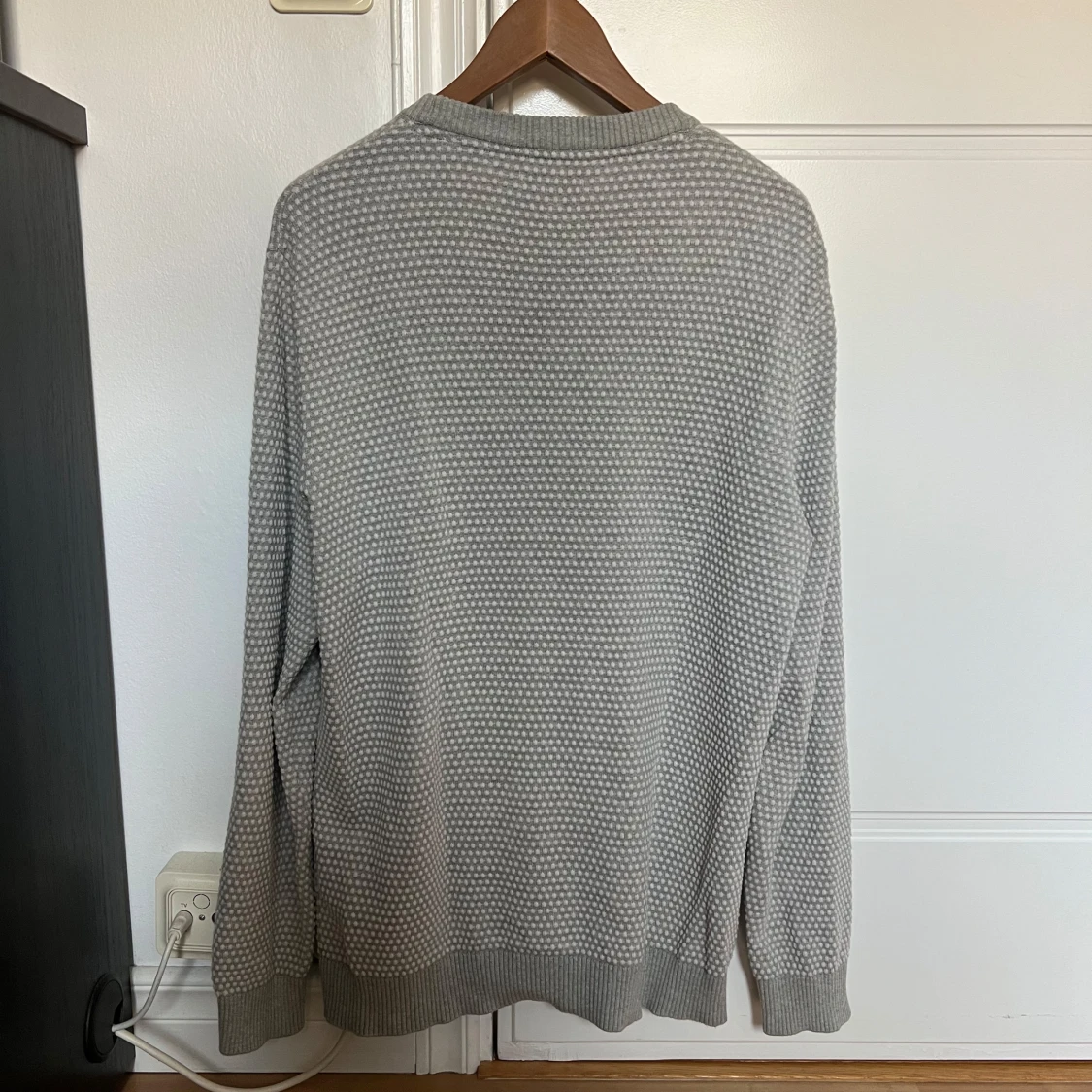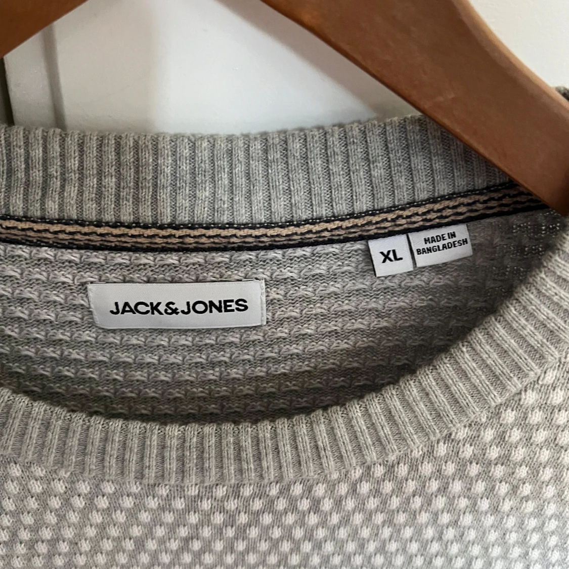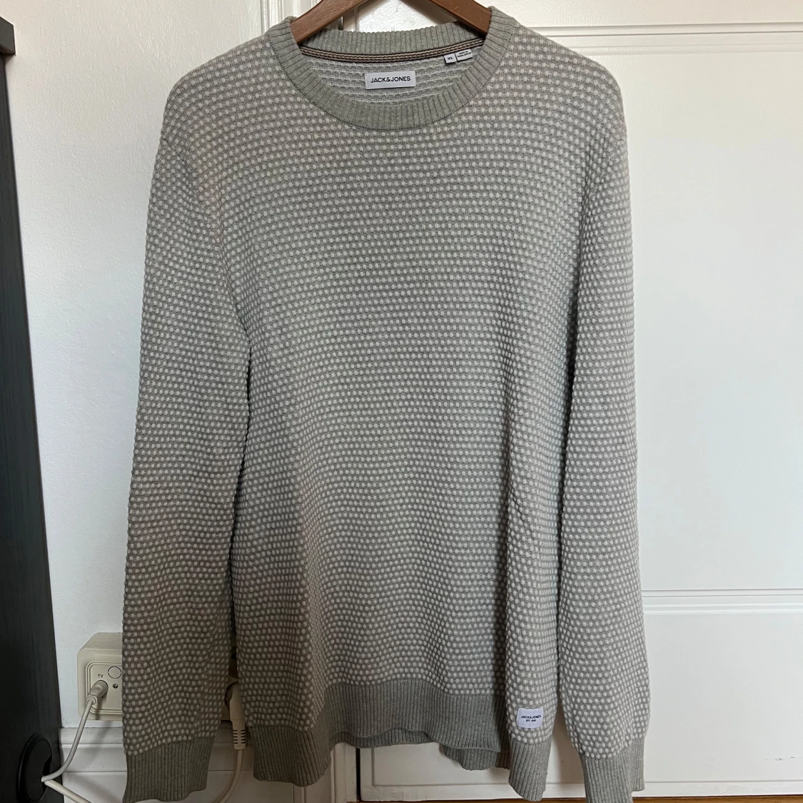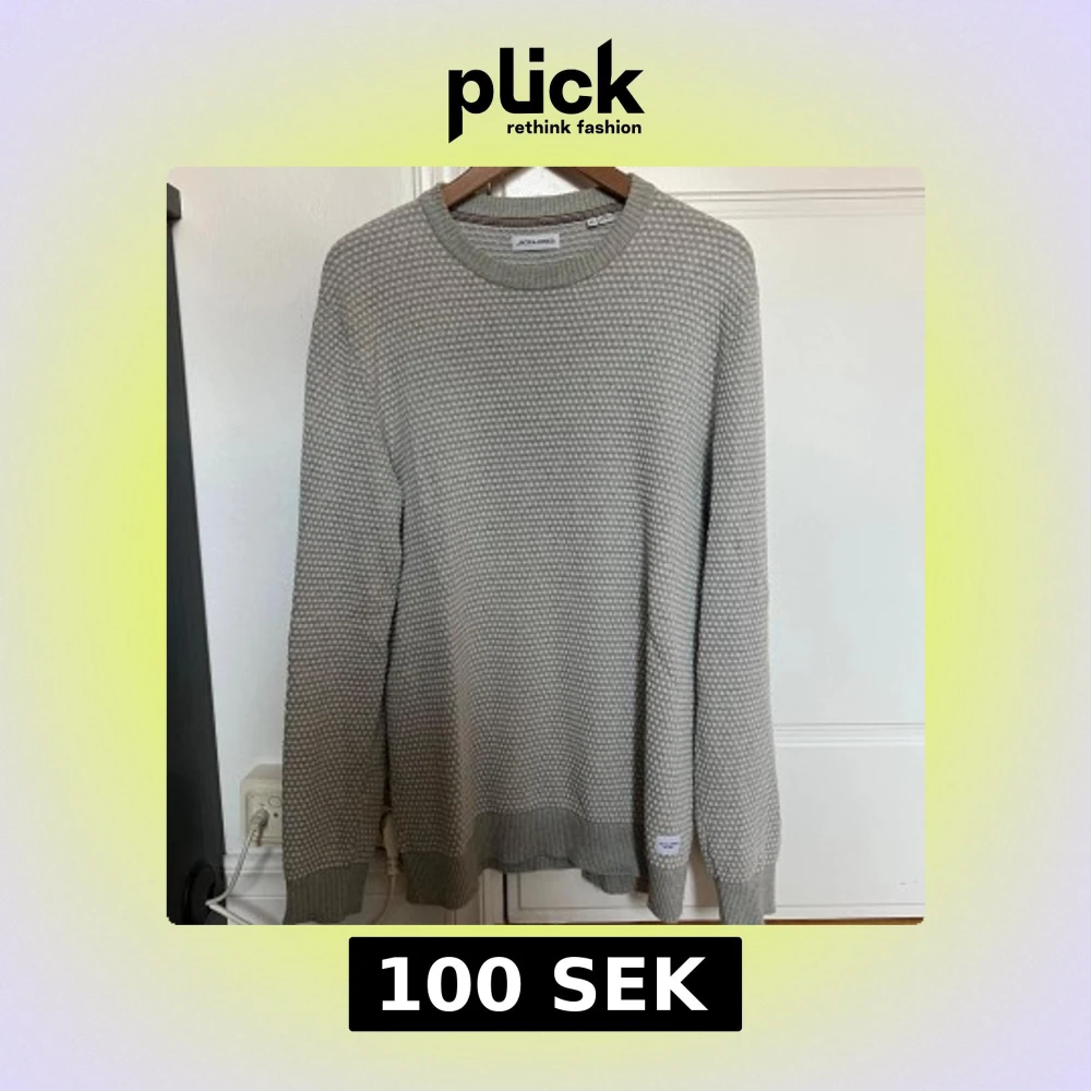 Säljer en grå stickad tröja från Jack & Jones i storlek XL. Tröjan har ett diskret prickigt mönster, rund halsringning och ribbade muddar vid ärmslut och nederkant. Perfekt för lager-på-lager under höst och vinter. Tröjan är liten i storleken och sitter mer som L.