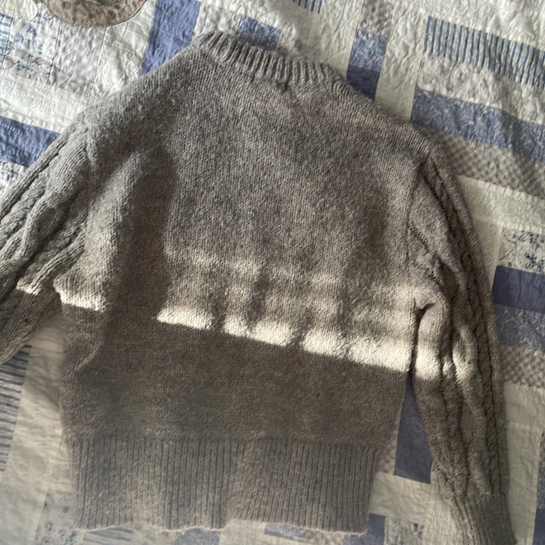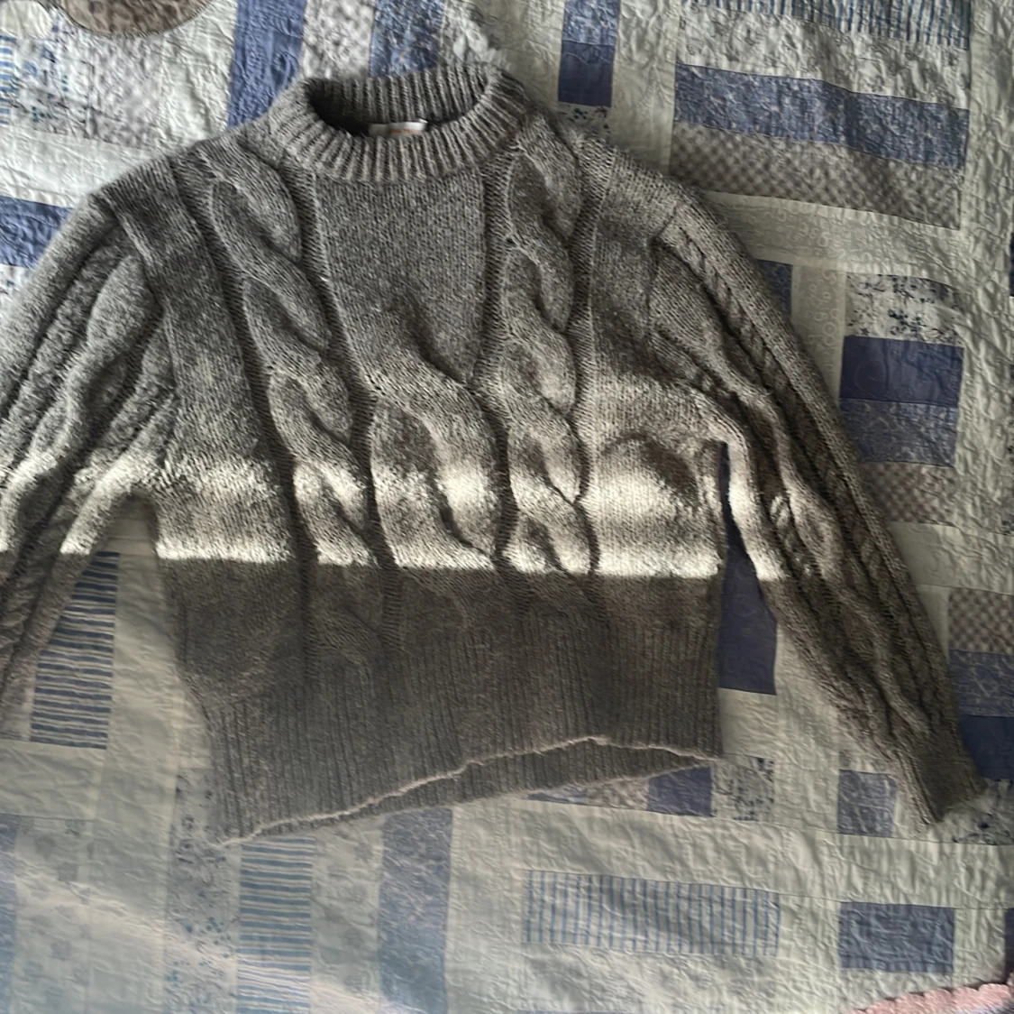 Säljer en mysig grå stickad tröja med ett snyggt flätmönster på framsidan. Tröjan har långa ärmar och en ribbad krage samt ribbade muddar vid ärmslut och nederkant. Perfekt för kyliga dagar!