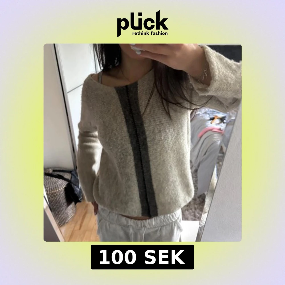 Säljer en beige stickad tröja med en bred grå rand framtill. Tröjan har lång ärm och en lite lös passform. Perfekt för dig som gillar en enkel men snygg stil.