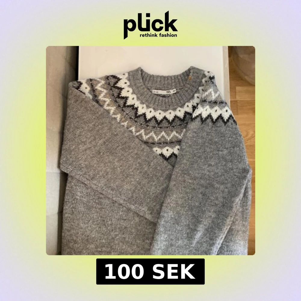 Säljer en grå stickad tröja från 157 med klassiskt nordiskt mönster i vitt och mörkgrått runt halsen. Tröjan har rund halsringning och långa ärmar med ribbade muddar. Perfekt för kyliga dagar!