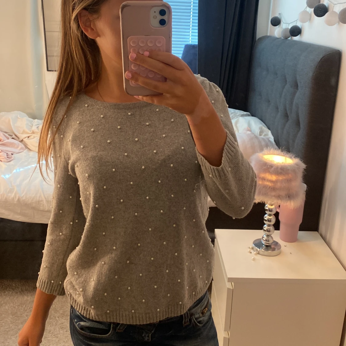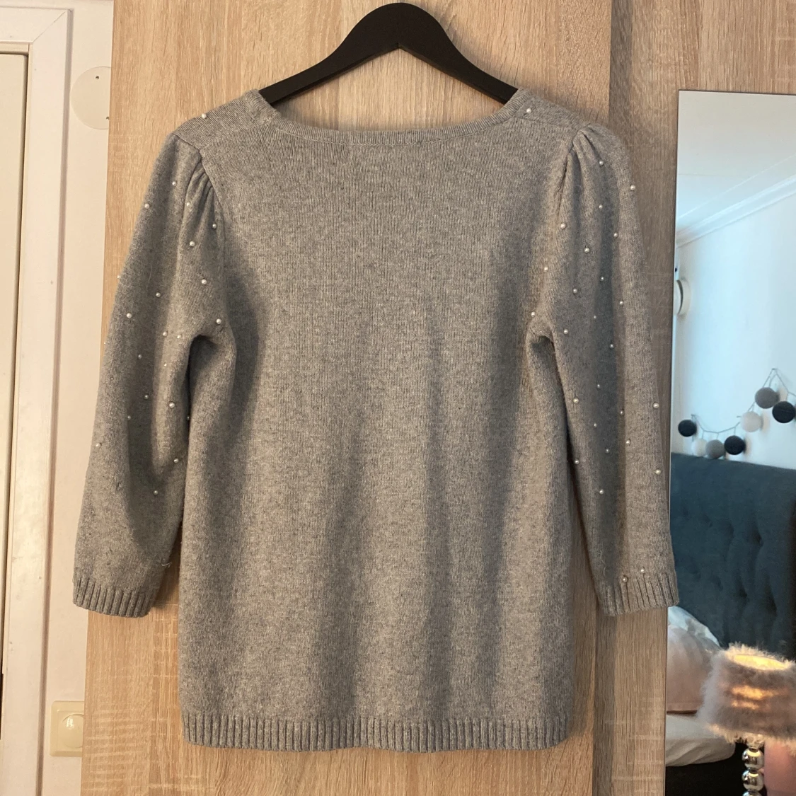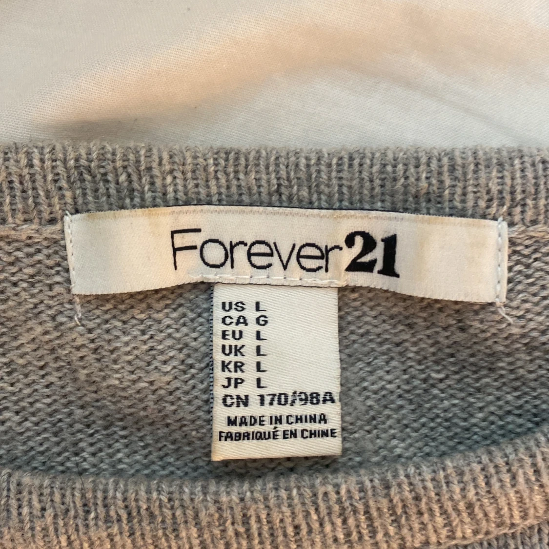 Grå stickad tröja från Forever21 med pärldetaljer över hela framsidan och ärmarna. Tröjan har trekvartsärm och rund halsringning. Jag har vanligtvist storlek xs till s i tröjor men denna i storlek L passar mig.