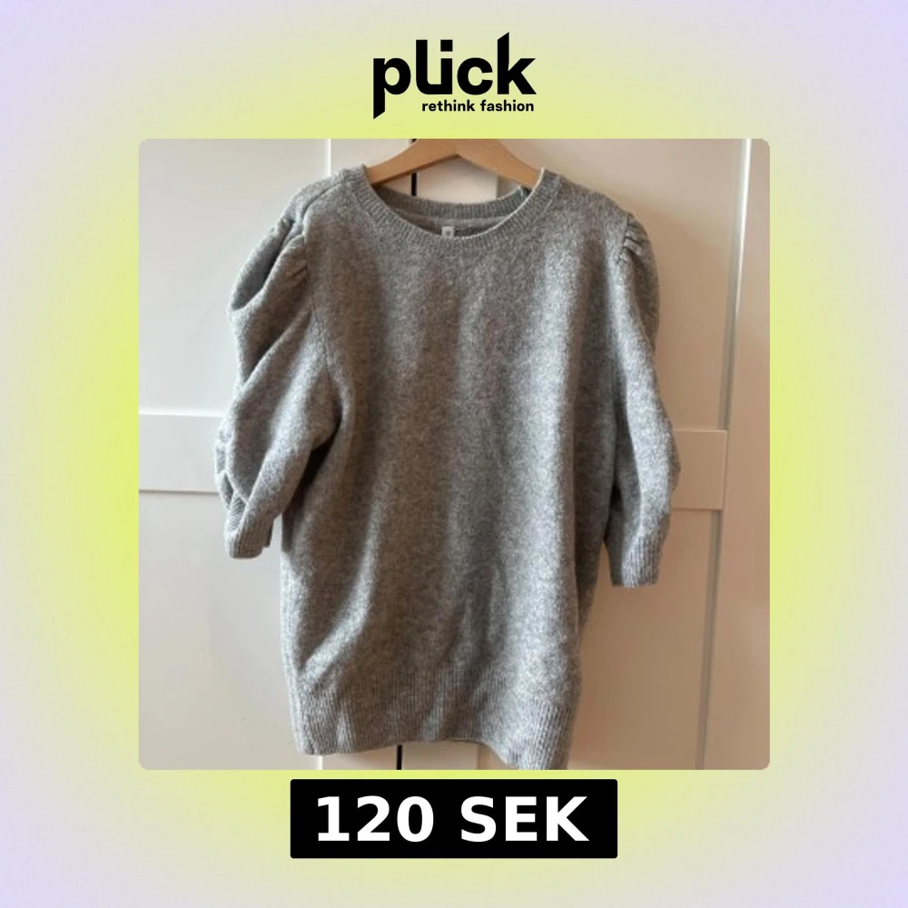 Mysig grå stickad tröja i storlek S med puffade trekvartsärmar och rund hals. Tröjan har ribbade muddar vid ärmslut och nederkant, vilket ger en snygg och chill look. Perfekt för dig som gillar enkel stil med en twist.
