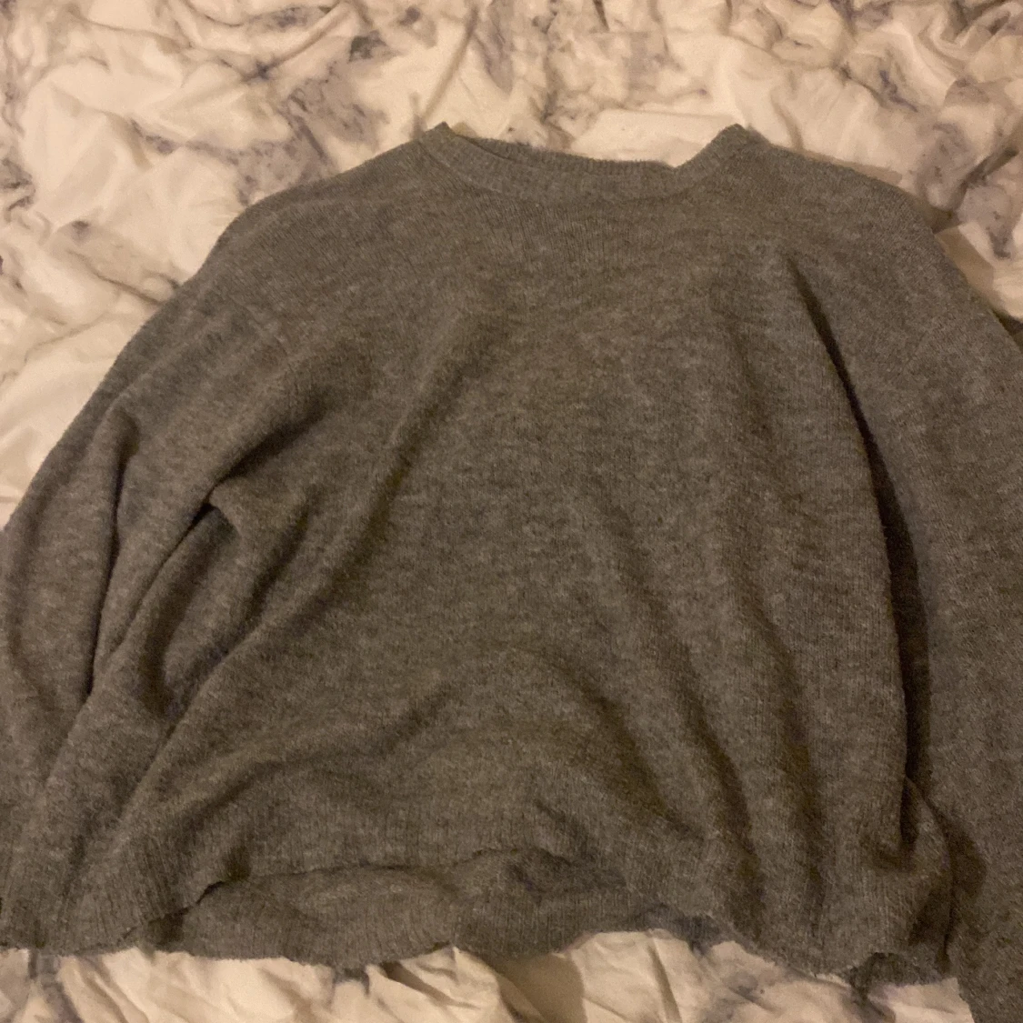 Mysig grå stickad tröja med rund hals och avslappnad passform. Perfekt för kyliga dagar och enkel att matcha med jeans eller kjol. Tröjan har långa ärmar och är superbekväm att bära.