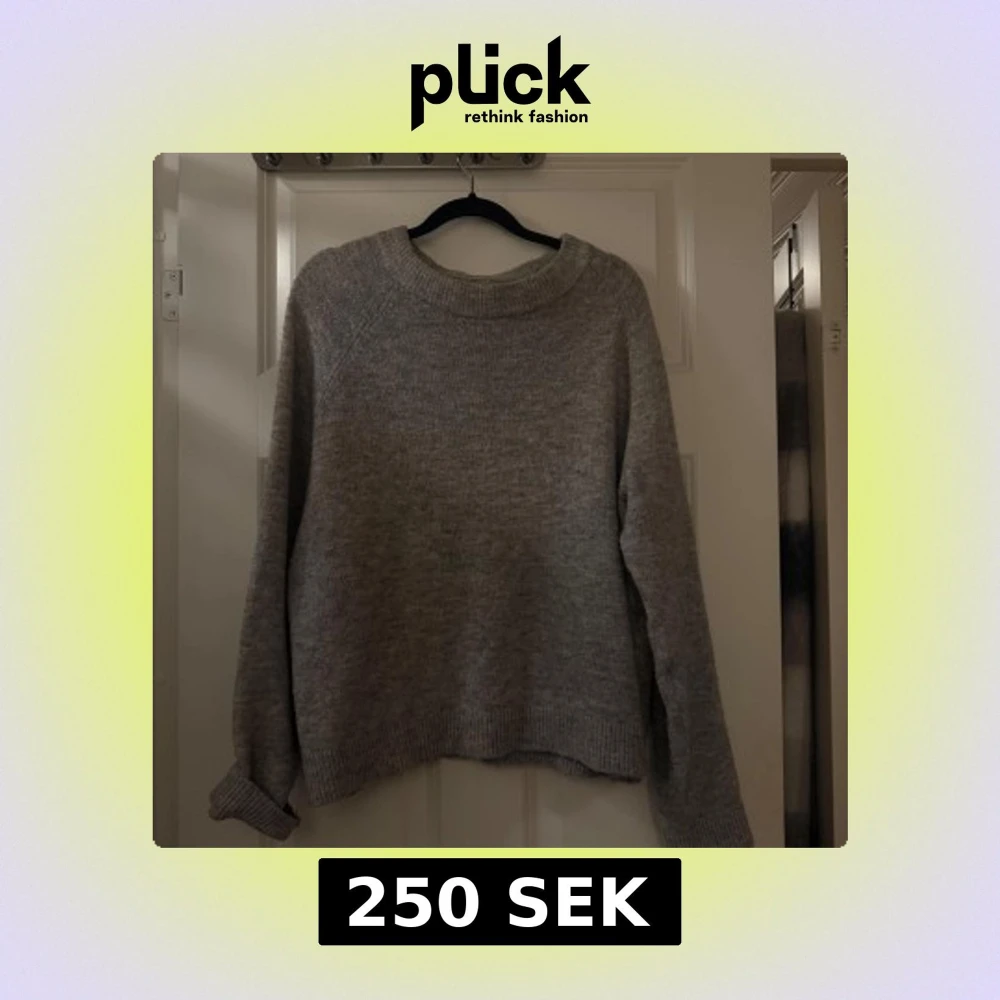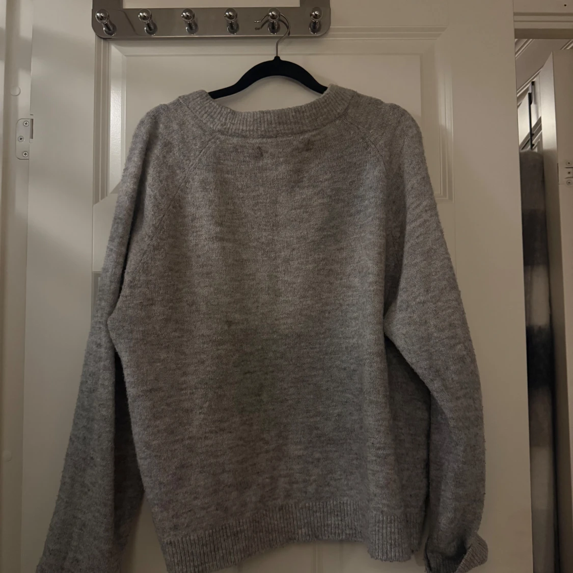 Mysig grå stickad tröja med rund halsringning och ribbade muddar vid ärmslut och nederkant. Är en xl men är mer som en m