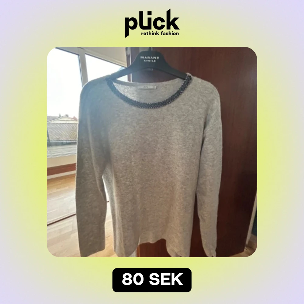 Säljer denna gråa stickade tröja med blåa stenar/pärlor!! Den är använd få gånger och är därför i bra skick ❣️❣️