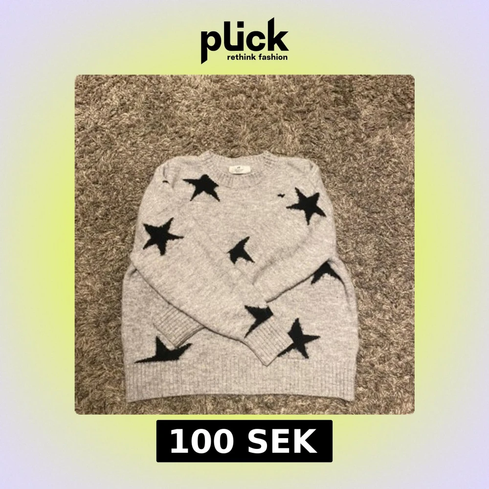Supermysig grå stickad tröja från H&M med stora svarta stjärnor över hela tröjan. Rund halsringning och långa ärmar med ribbade muddar. Perfekt för dig som gillar en chill och trendig look.
