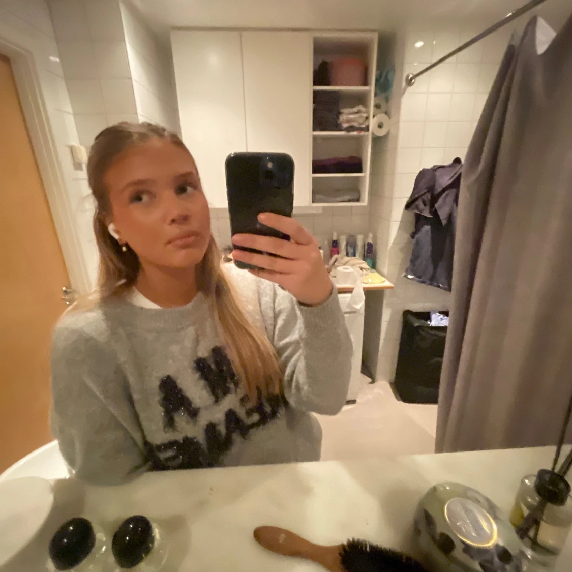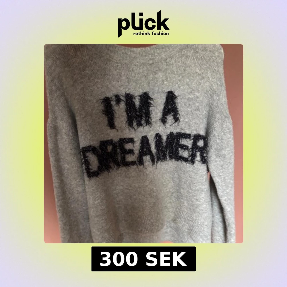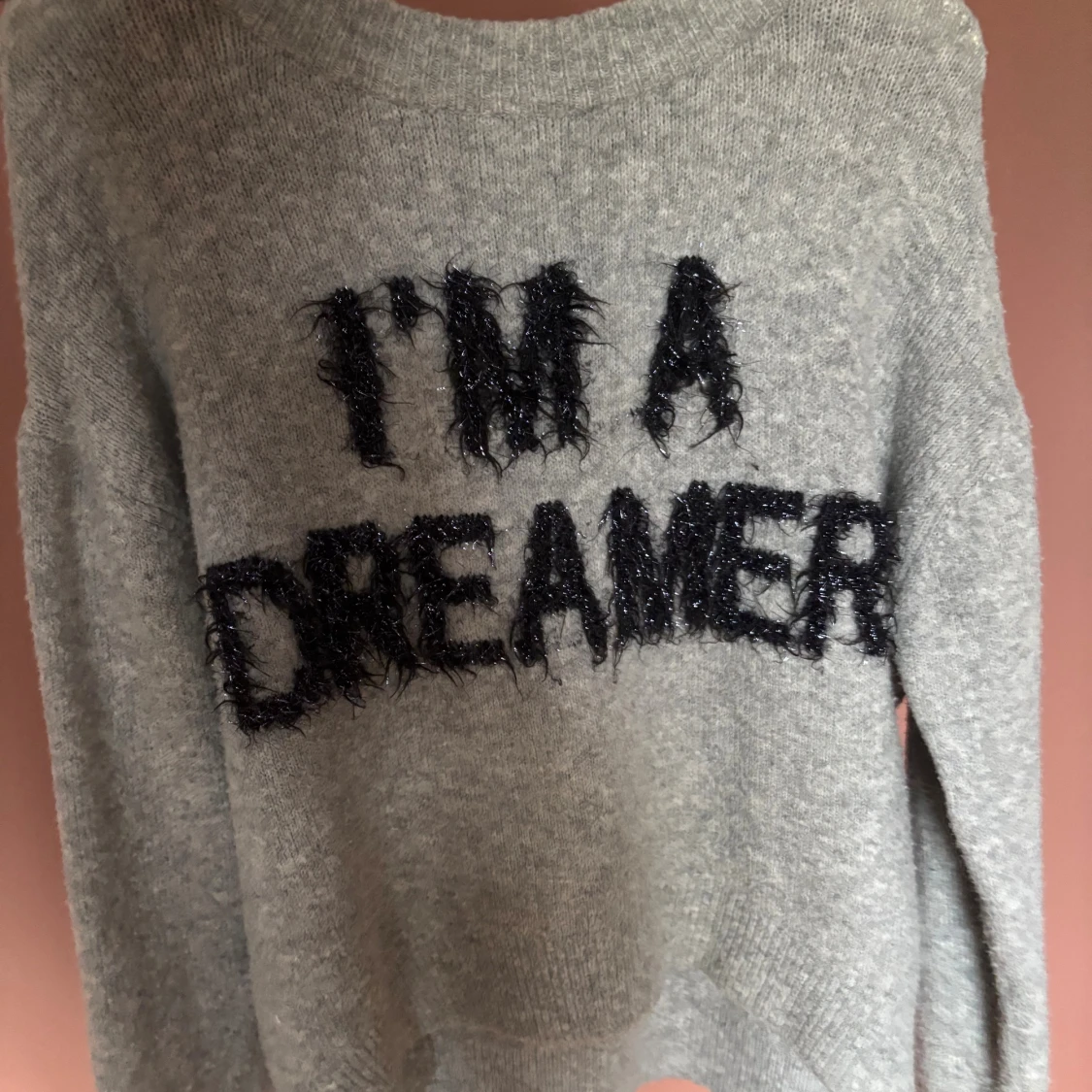 Mysig grå stickad tröja med svart fluffig text 'I'M A DREAMER' framtill. Tröjan har rund halsringning och långa ärmar. Perfekt för dig som gillar statement-plagg och vill ha något unikt och bekvämt i garderoben.