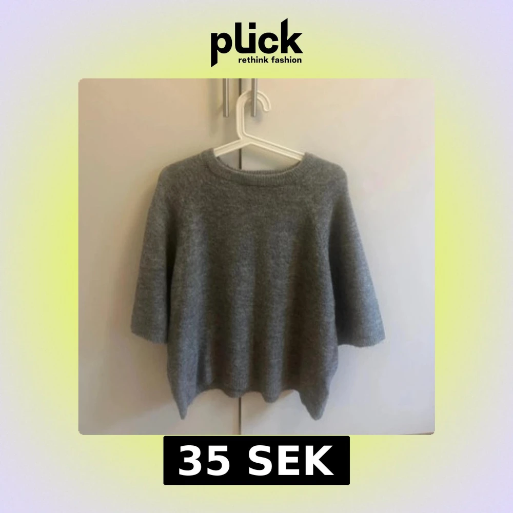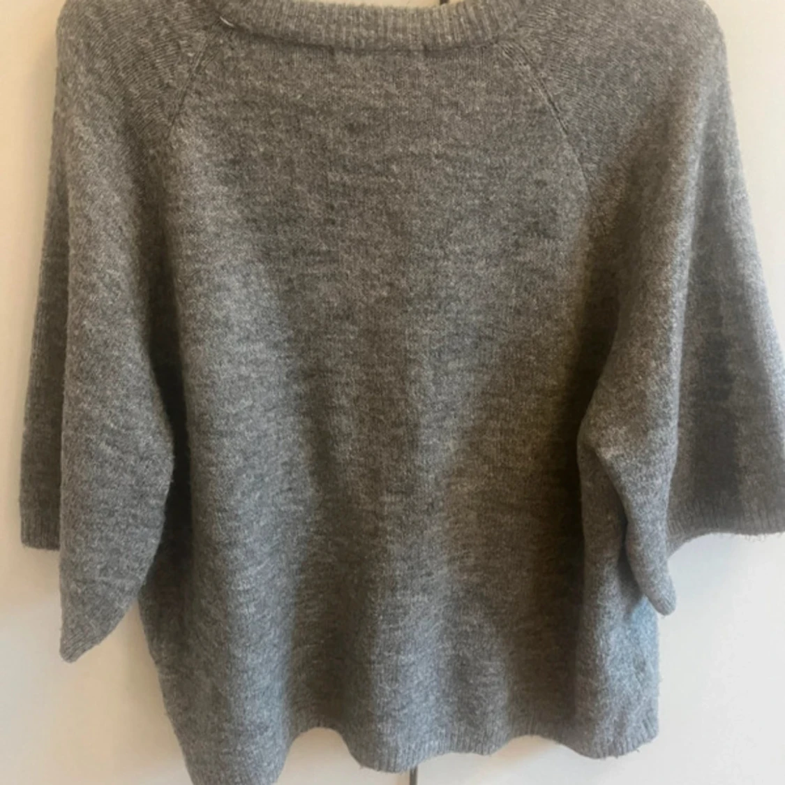 Mysig grå stickad tröja med rund halsringning och trekvartsärmar. Tröjan har en loose passform och är stor i storleken. Använd en gång, och dessvärre lite luddig.