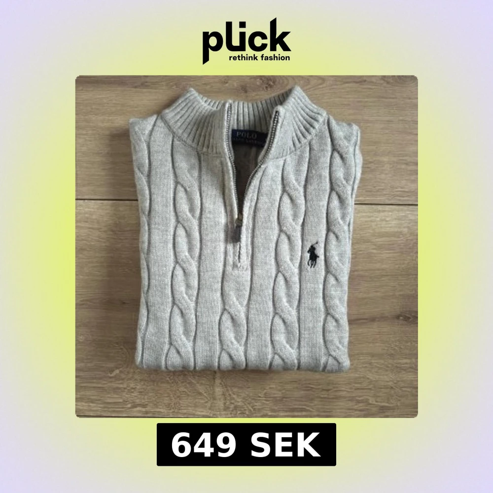 Säljer en grå stickad tröja från Polo Ralph Lauren med klassiskt flätmönster och half zip vid halsen. Tröjan har ribbad krage och det ikoniska Polo-logot broderat på bröstet. Perfekt för dig som gillar stilren och tidlös design.