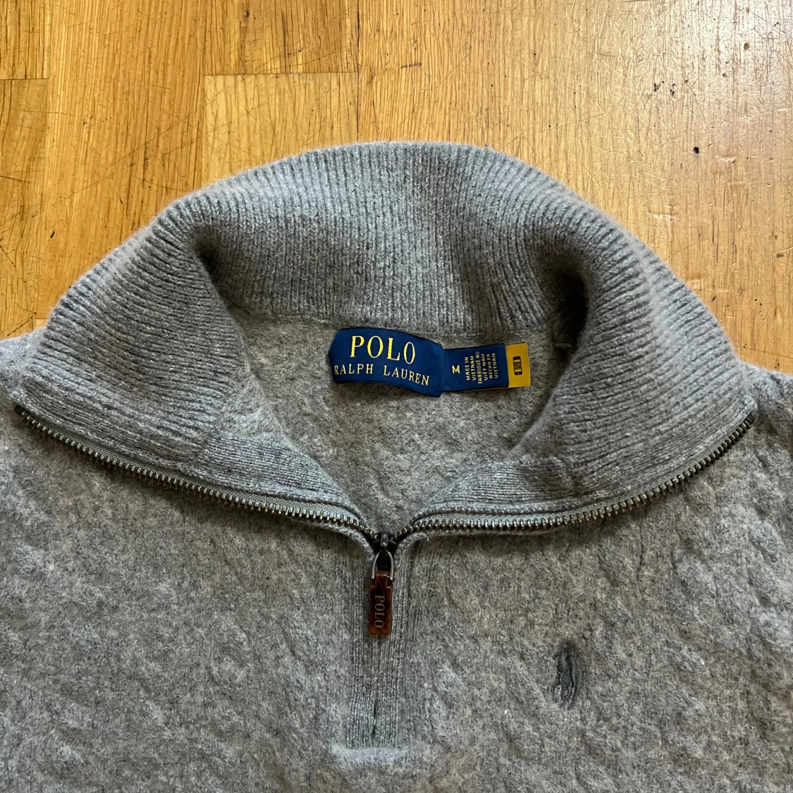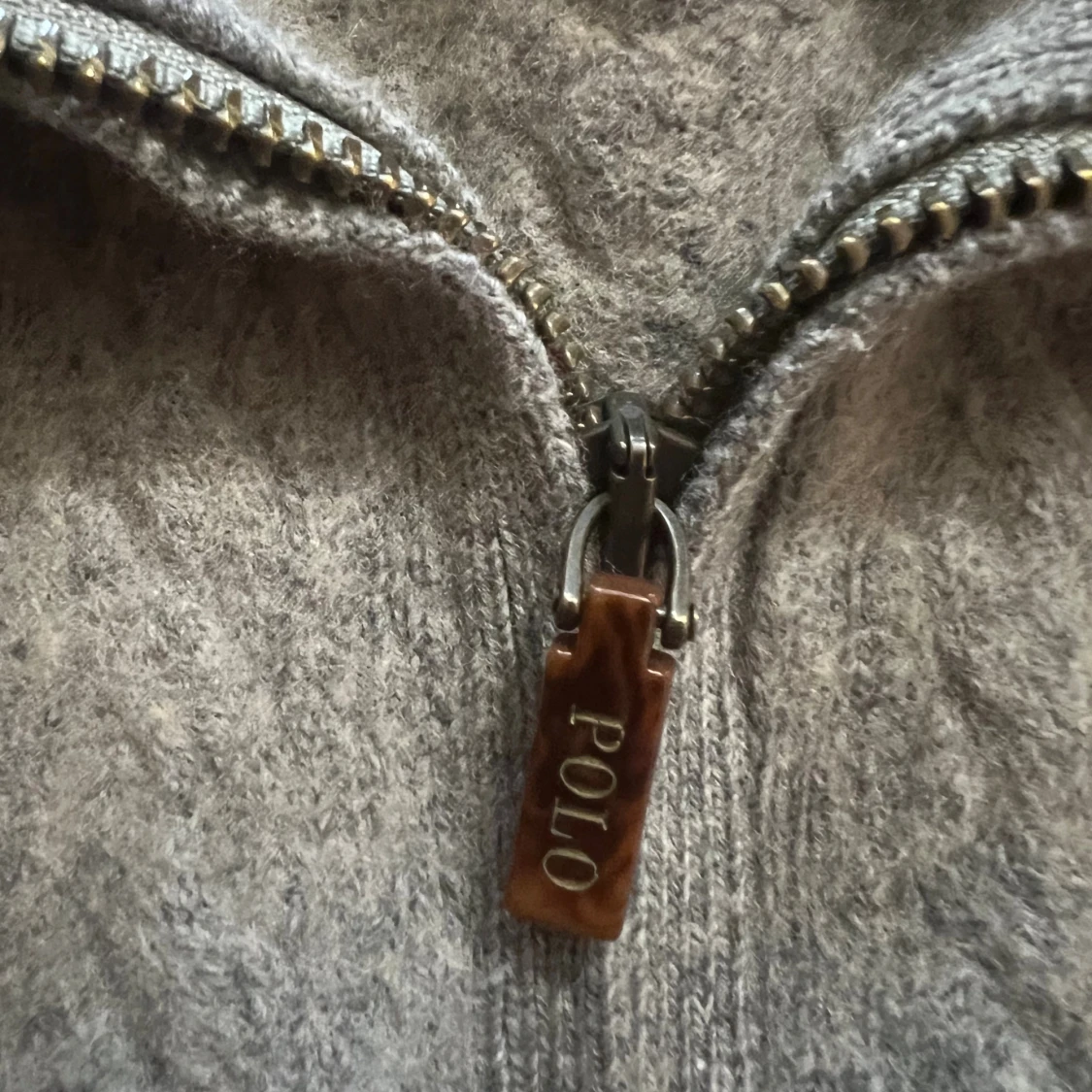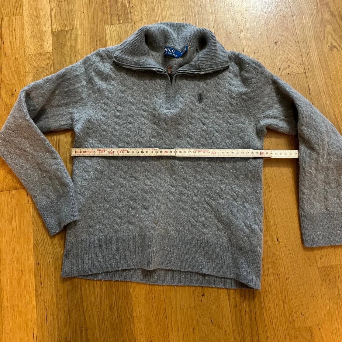 🛑OBS! Kolla beskrivningen snälla!! Storlek: M (men har krympt)! Säljer en klassisk grå kabelstickad tröja från Polo Ralph Lauren med halvlång dragkedja i kragen. Tröjan är ursprungligen i storlek M och köptes för cirka ett år sedan på Magasin i Danmark. Den har handtvättats enligt anvisningarna, men råkade därefter tvättas i 40 grader tillsammans med andra kläder, vilket gjort att den krympt och nu motsvarar ungefär en XS i passform (eller barnstorlek 140 cl,10år). Axel bredd = 40cm, längd 48cm