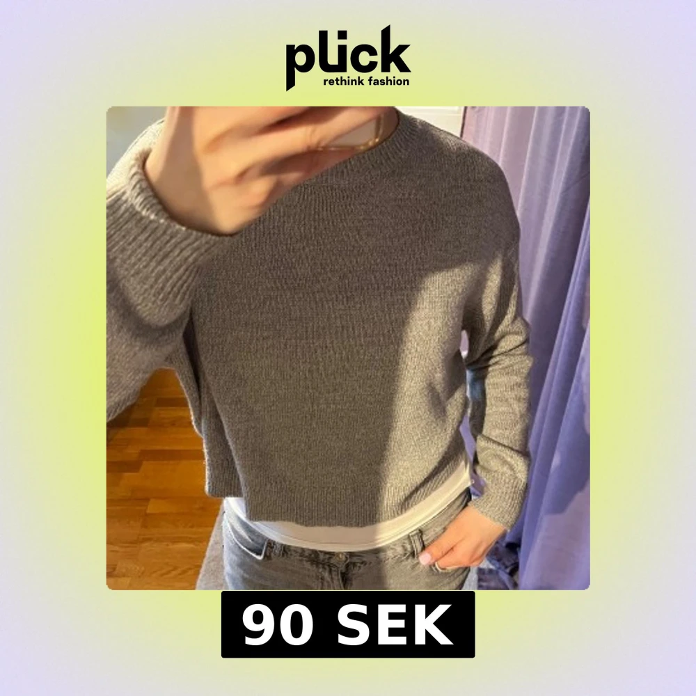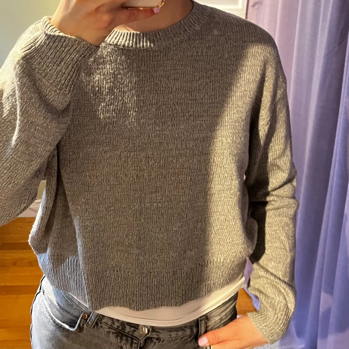 Säljer en stilren grå stickad tröja med rund hals och långa ärmar. lätt att matcha med olika outfits. Tröjan har en avslappnad passform och ribbade muddar vid ärmslut och nederkant.