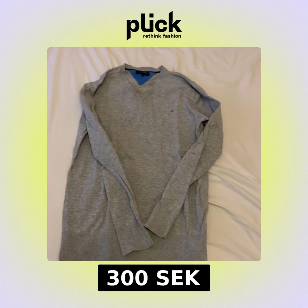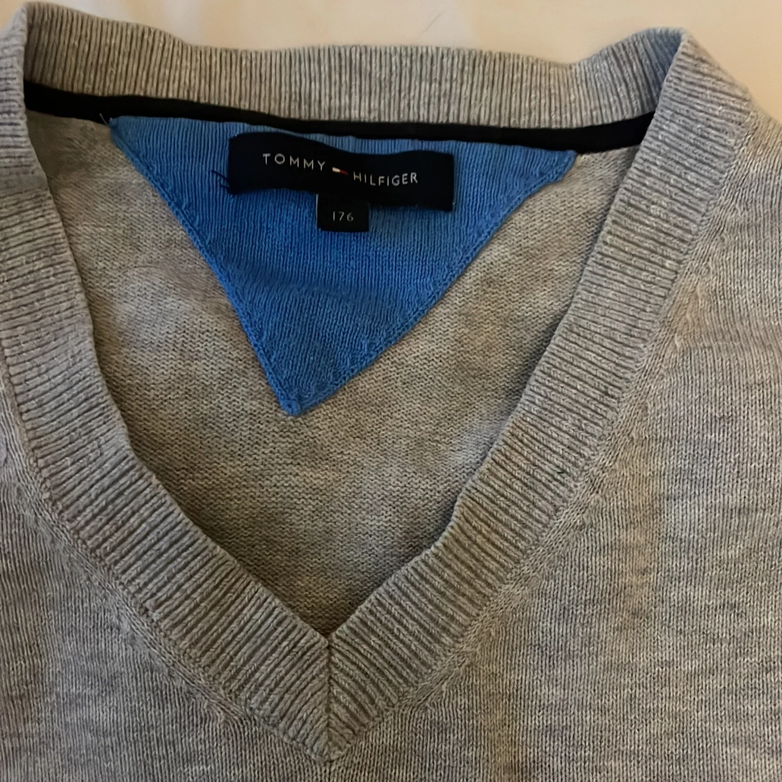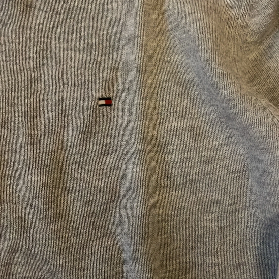 Snygg grå stickad tröja från Tommy Hilfiger med v-ringning och diskret logga på bröstet. Tröjan har långa ärmar och ribbade muddar vid hals, ärmslut och nederkant.