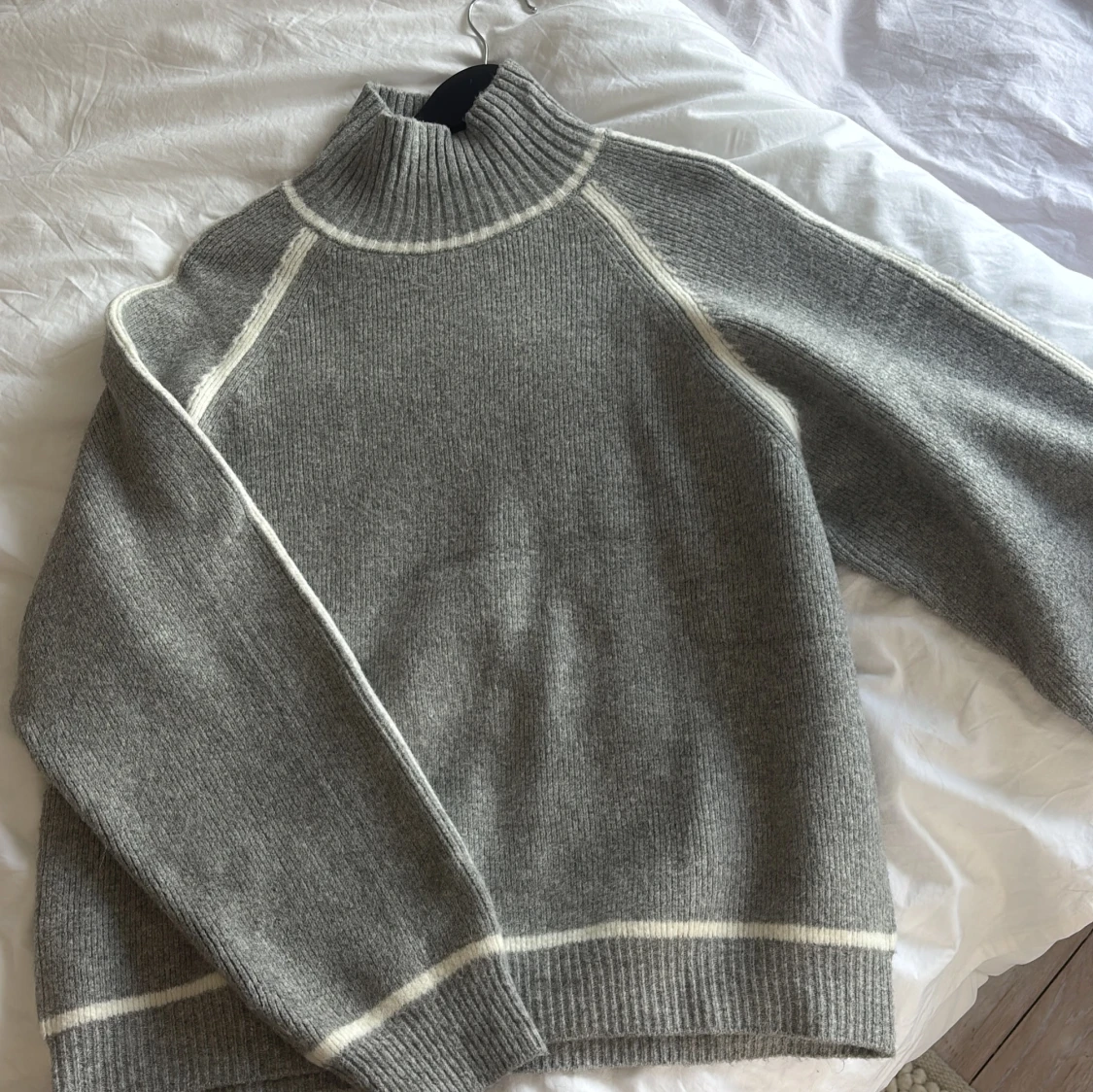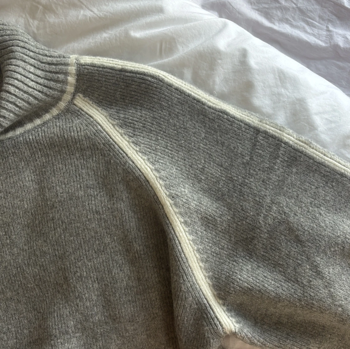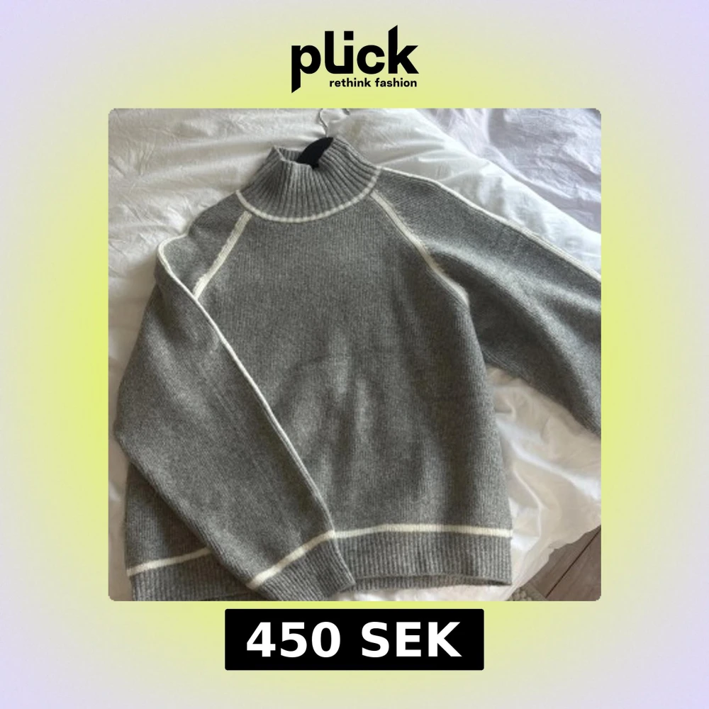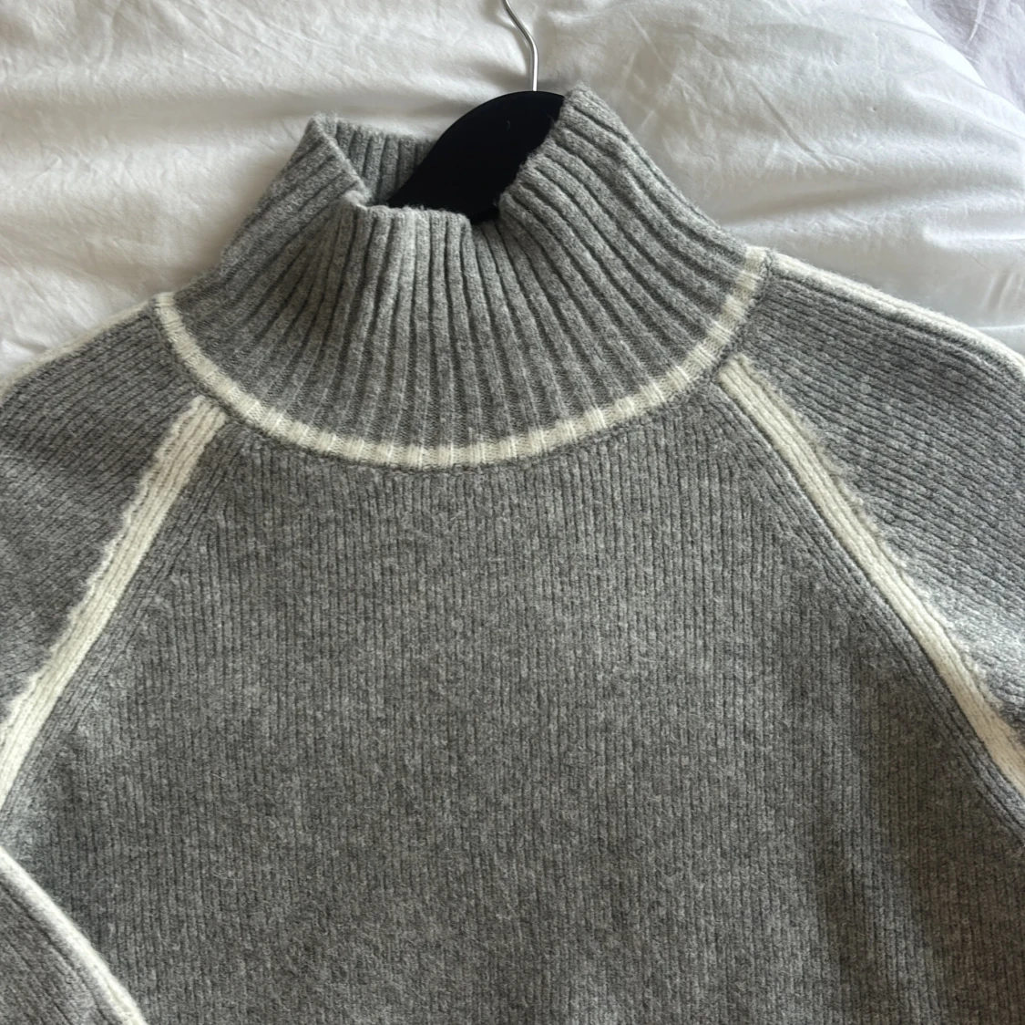 Säljer en stilren grå stickad polotröja från Mango med vita detaljer längs sömmarna. Tröjan har en hög ribbad krage och långa ärmar. Passar utmärkt till både jeans och kjol. använd 1 gång!