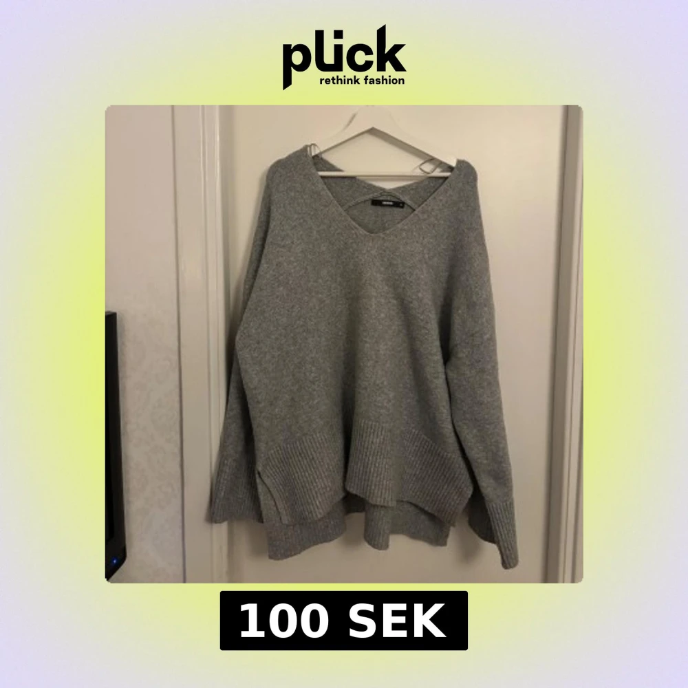 Mysig grå stickad tröja från Bik Bok med v-ringning och ribbade muddar. Tröjan har en loose passform och långa ärmar, perfekt för lager på lager under kyliga dagar.