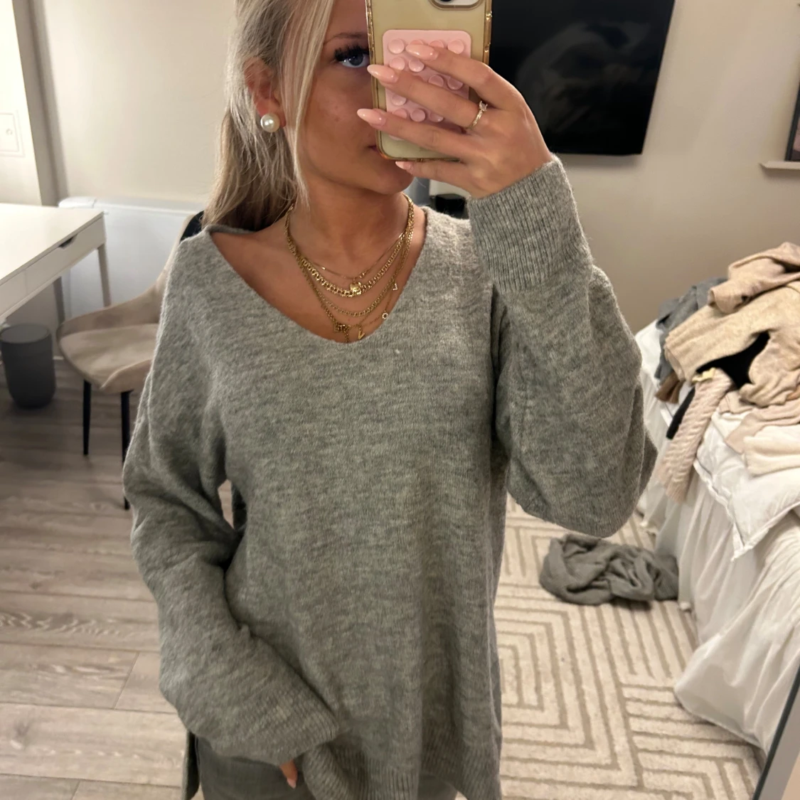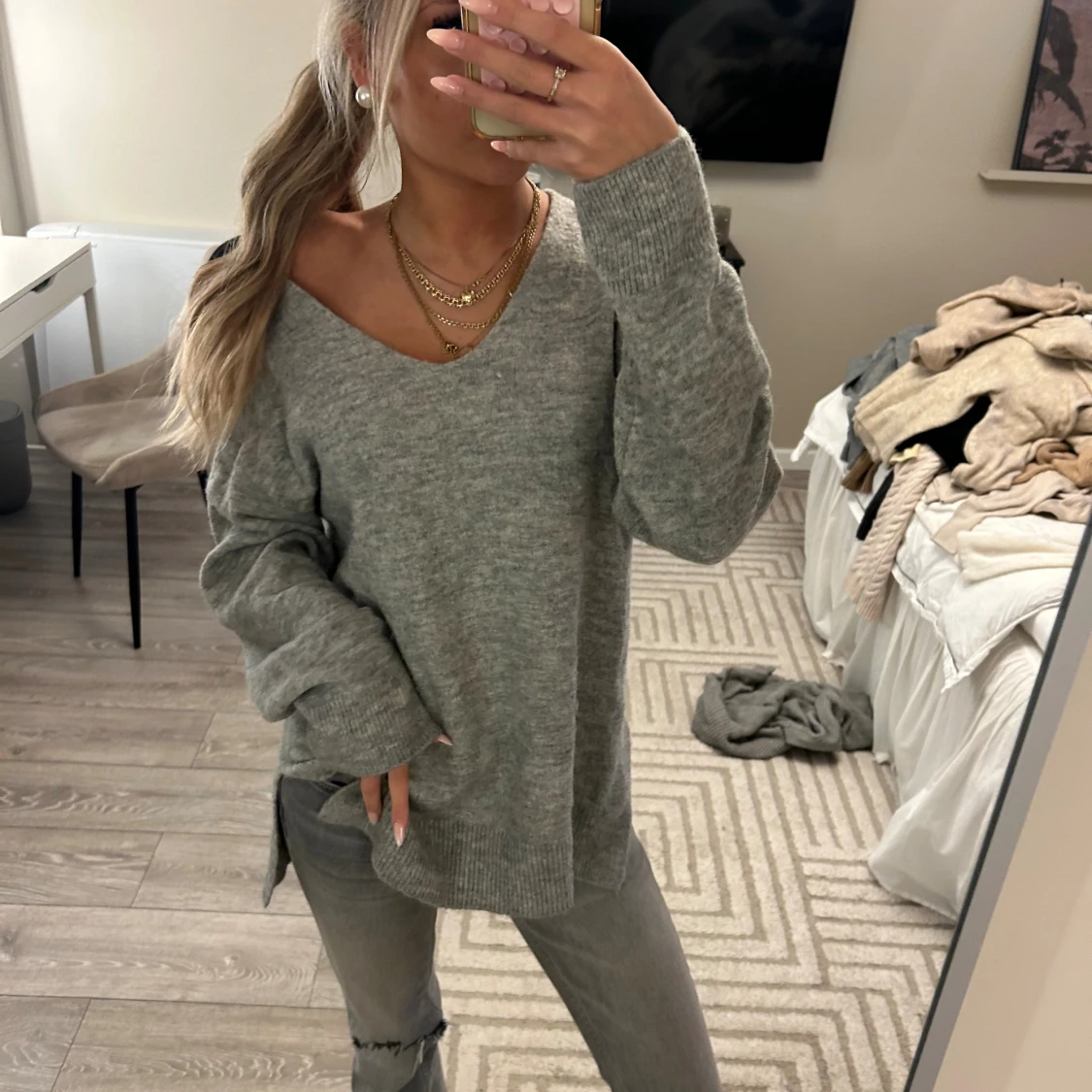 Mysig grå stickad tröja med v-ringning och lång ärm. Tröjan har en loose passform och är perfekt för lager-på-lager. Ribbstickade muddar och slits i sidorna ger en chill vibe. Passar dig som gillar en avslappnad och trendig stil.