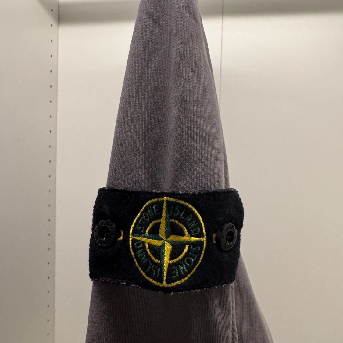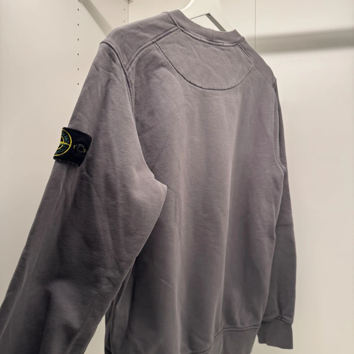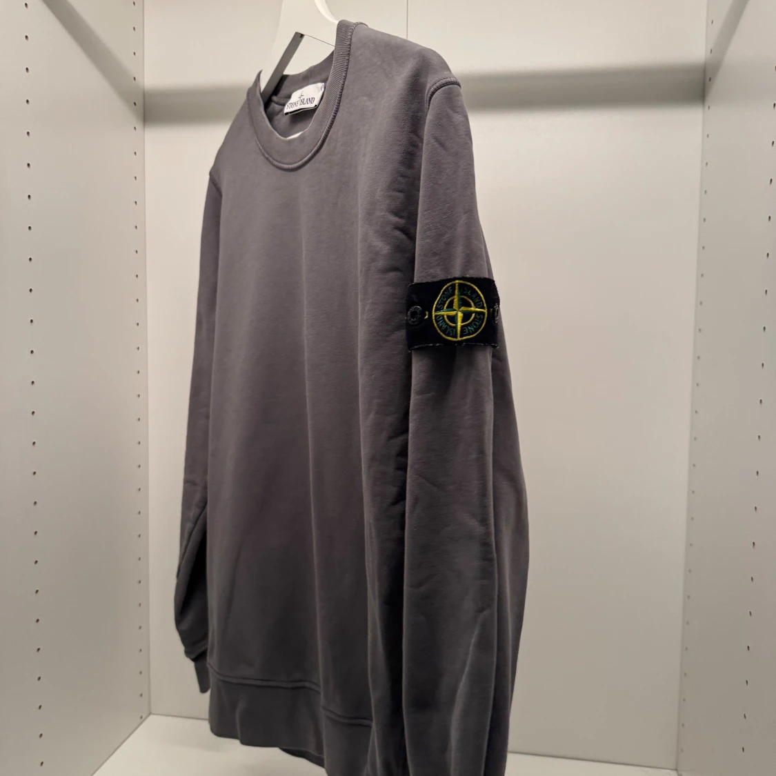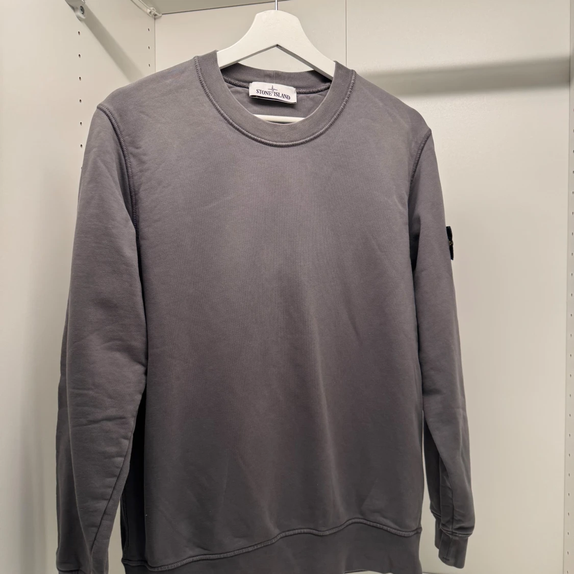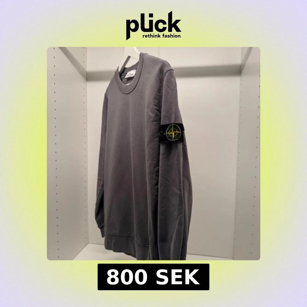 Säljer en grå sweatshirt från Stone Island med klassisk rund hals och ikonisk patch på vänster ärm. Tröjan har en clean look, ribbade muddar och är tillverkad i mjuk bomull. Perfekt för dig som gillar streetwear och vill ha något stilrent.