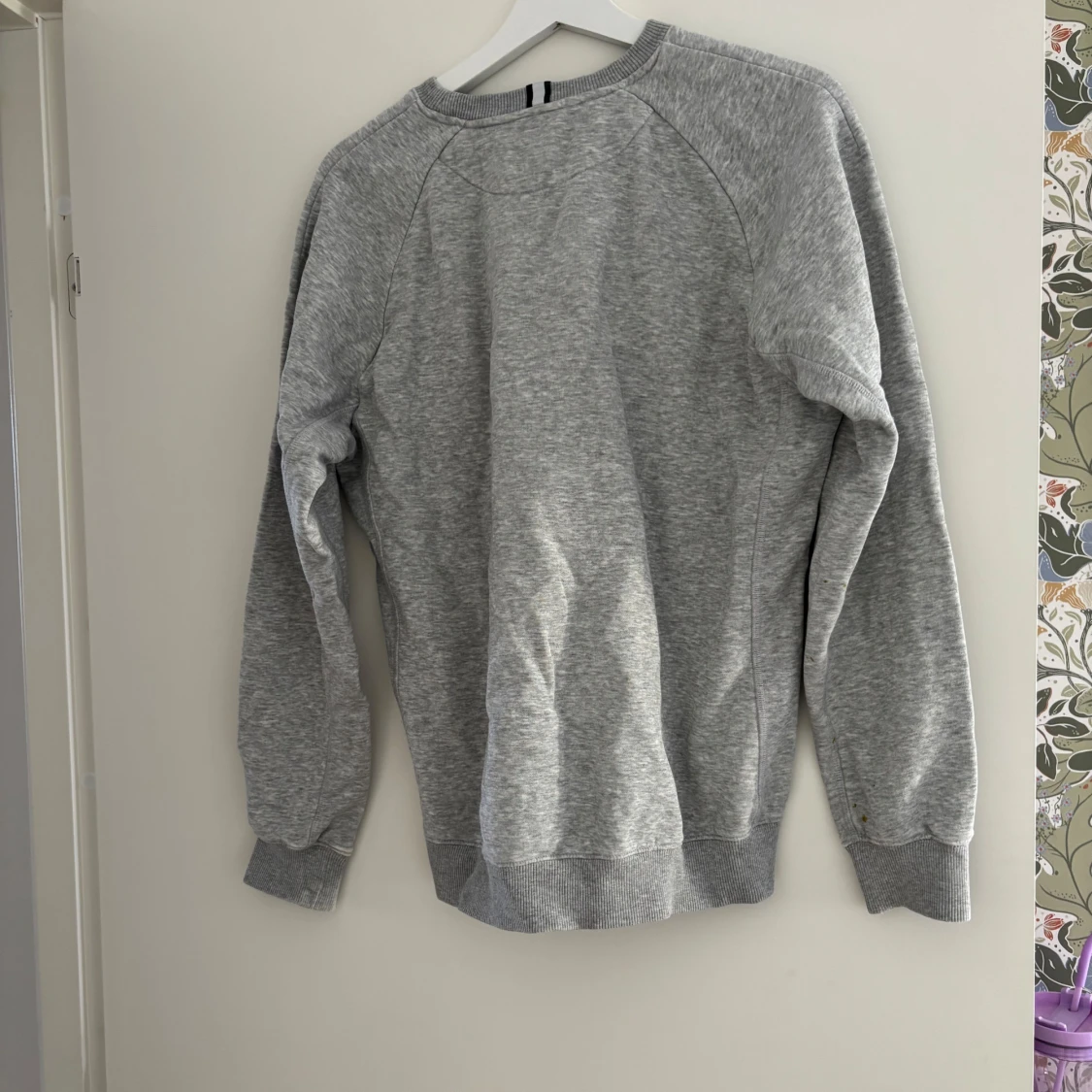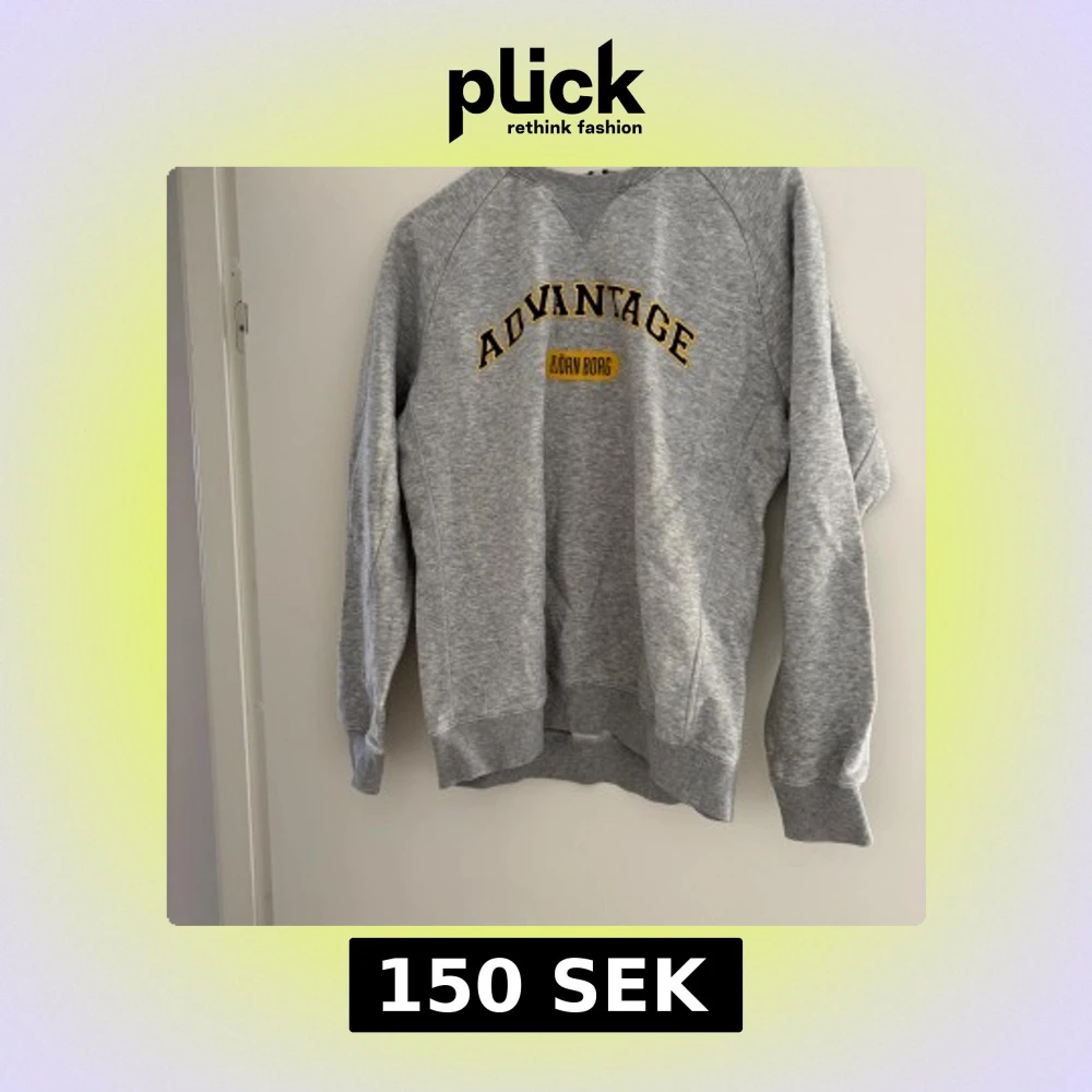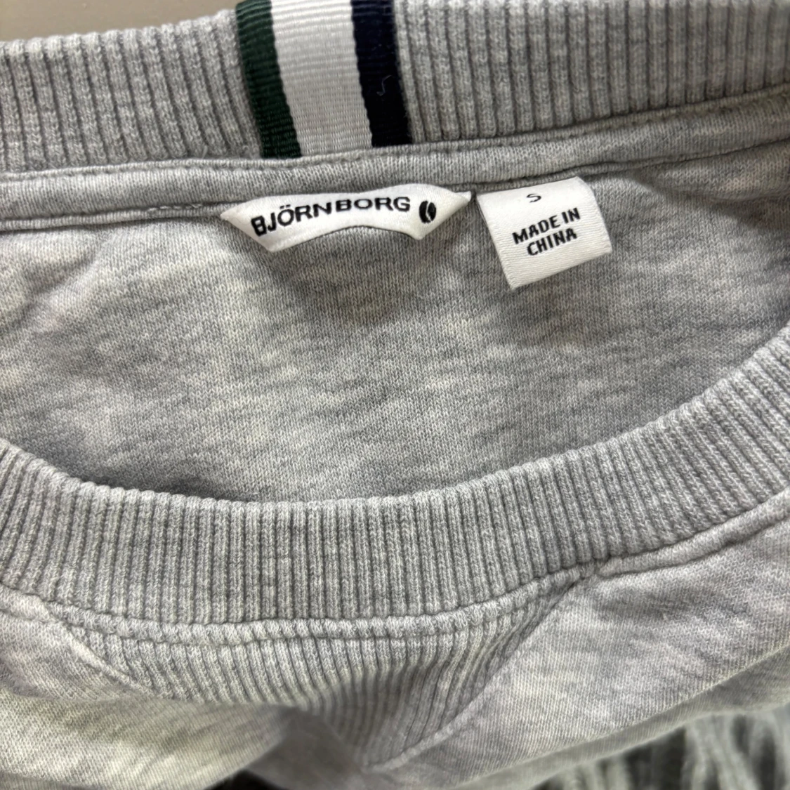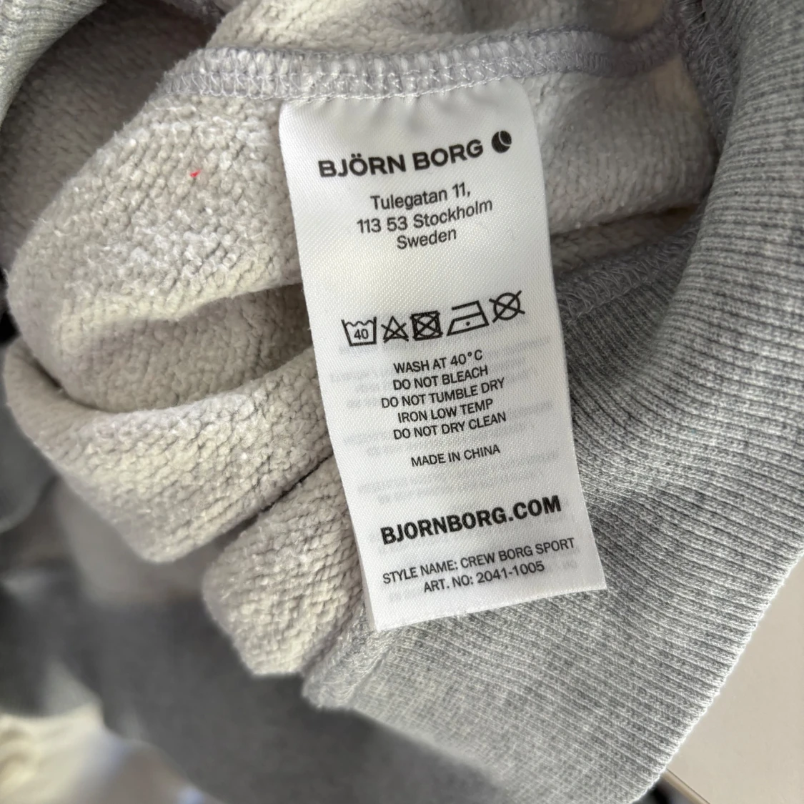 Säljer en grå sweatshirt från Björn Borg med trycket 'ADVANTAGE' i svart och gult på bröstet. Tröjan har rund hals, långa ärmar och ribbade muddar. Perfekt för en sportig och avslappnad stil. Har en liten defekt på den högra armen, kolla bild
