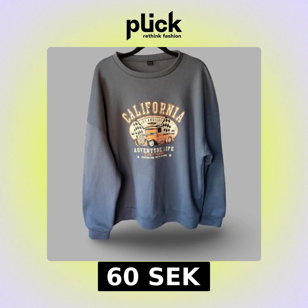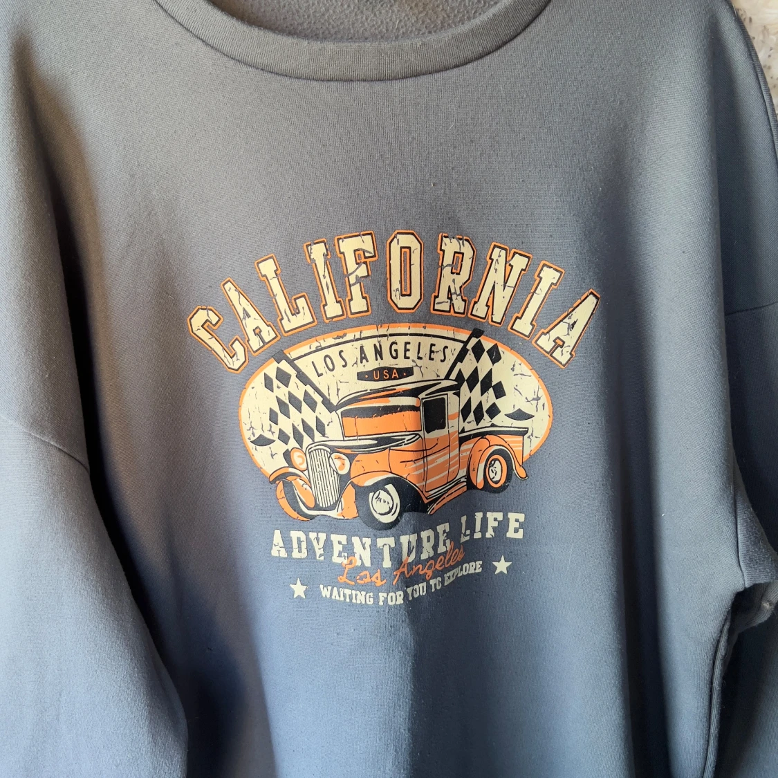 Cool grå sweatshirt från SHEIN med stort tryck framtill som visar en orange retrobil och texten 'California Adventure Life'. Tröjan har rund hals, långa ärmar och loose passform.
