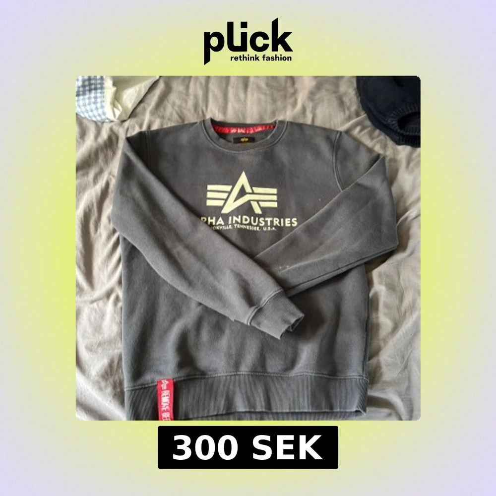 Säljer en grå sweatshirt från Alpha Industries med logga och tryck framtill. Tröjan har rund halsringning, långa ärmar och ribbade muddar. Klassisk och stilren modell med röd detalj nertill.