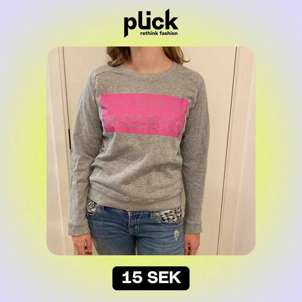 Säljer en grå sweatshirt från Black Story i storlek L. Den har ett coolt rosa tryck med texten 'I'LL BE READY IN A PROSECCO'. Perfekt för en avslappnad stil med långa ärmar och mjukt material. Passar bra till jeans för en casual look.