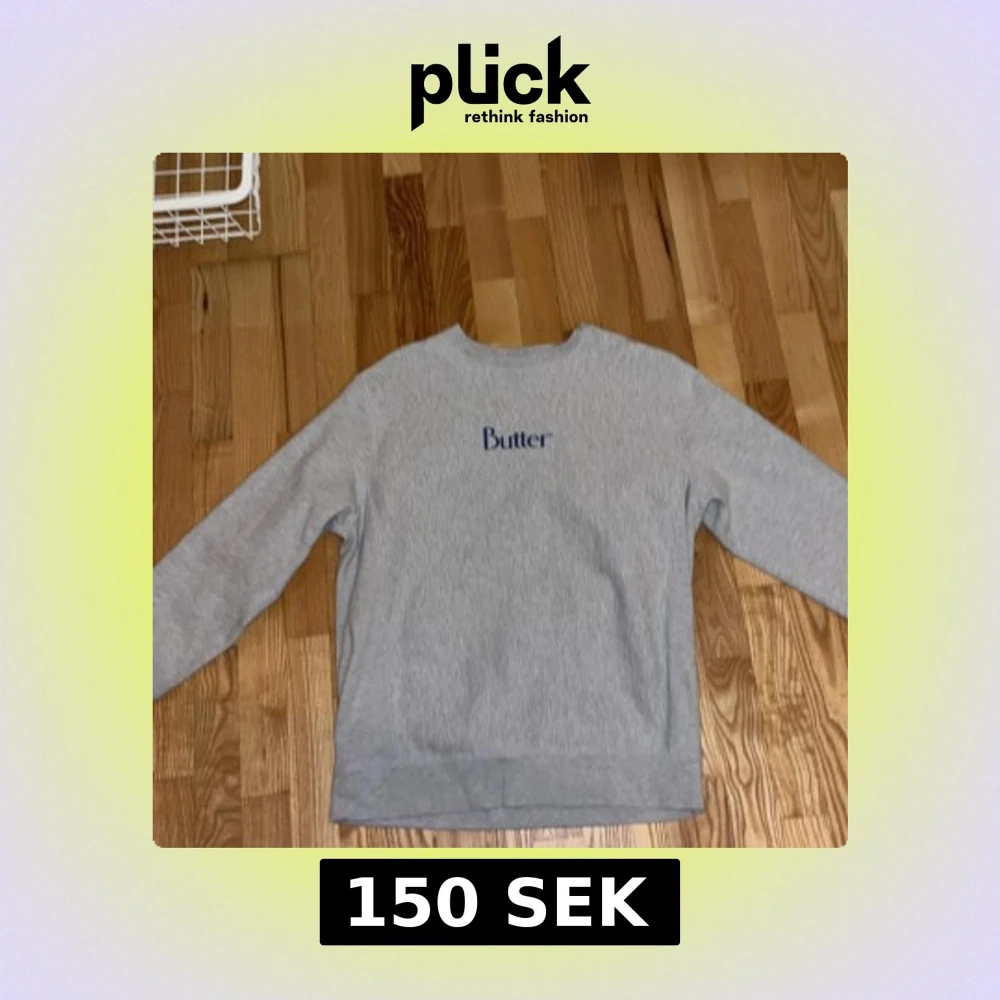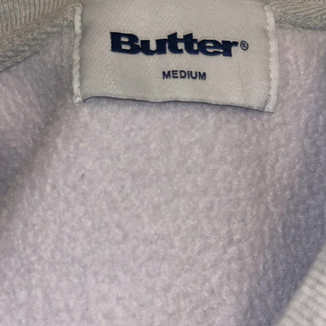 Säljer en stilren grå sweatshirt från Butter i storlek medium. Tröjan har rund halsringning, lång ärm och blå Butter-logga broderad på bröstet. Mjuk insida i fleece som gör den extra skön att ha på sig. Perfekt för en chill och avslappnad look.