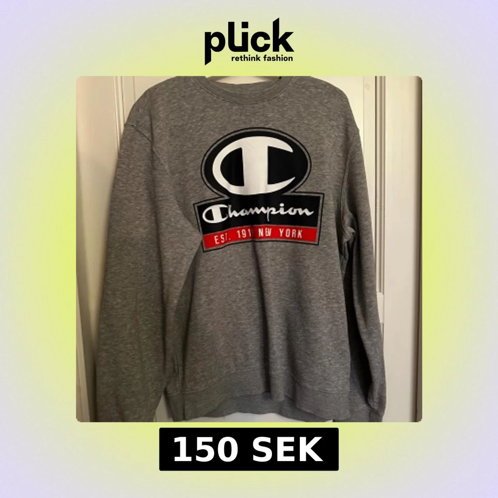 Säljer en grå sweatshirt från Champion med stort tryck på bröstet i svart, vitt och rött. Tröjan har rund halsringning och långa ärmar