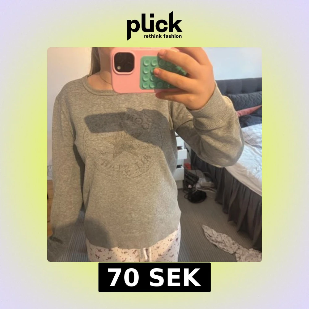 Säljer en grå sweatshirt från Converse med loggan på framsidan. Den är i storlek L men skulle säga att den passar S och M.