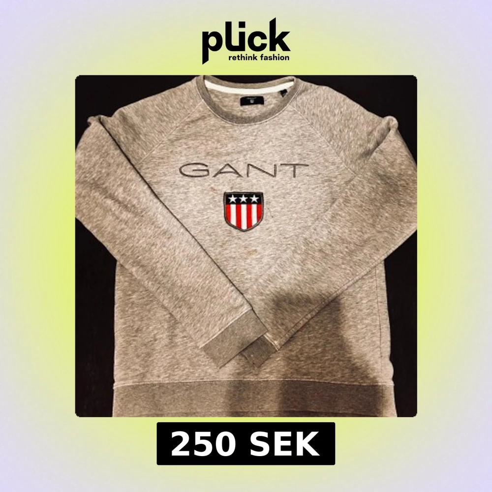 Säljer en stilren grå sweatshirt från GANT med broderad logotyp och emblem på bröstet. Tröjan har långa ärmar och rund halsringning, perfekt för en avslappnad look.