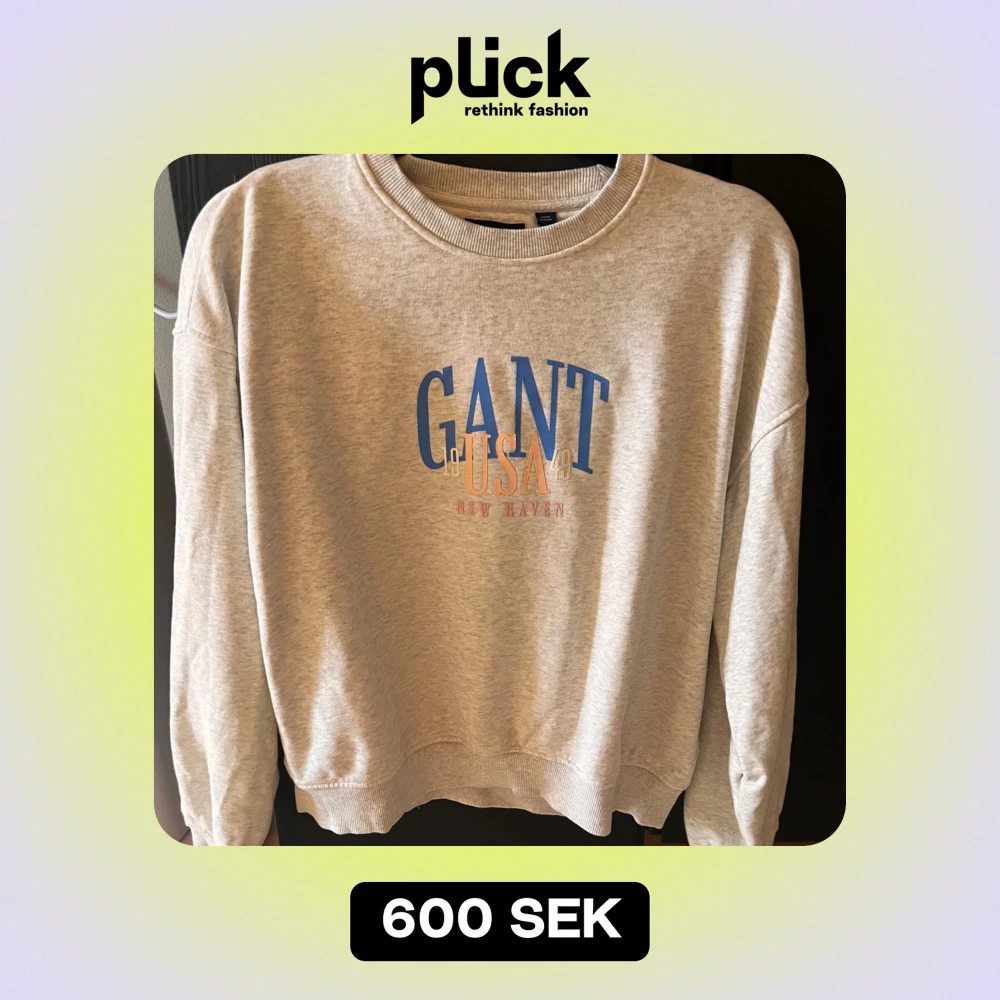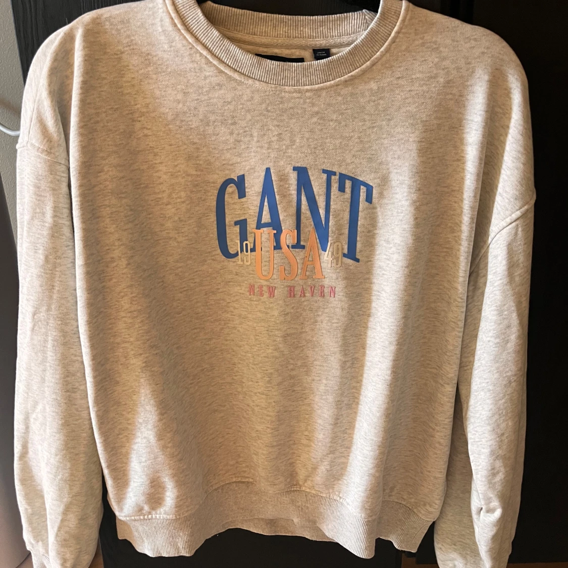 Säljer en snygg grå sweatshirt från GANT med tryck i blått och rött. Tröjan har en klassisk rund hals och långa ärmar, perfekt för en avslappnad stil. Den är i bra skick och passar perfekt för både höst och vår. Perfekt för dig som vill ha en stilren och bekväm look!