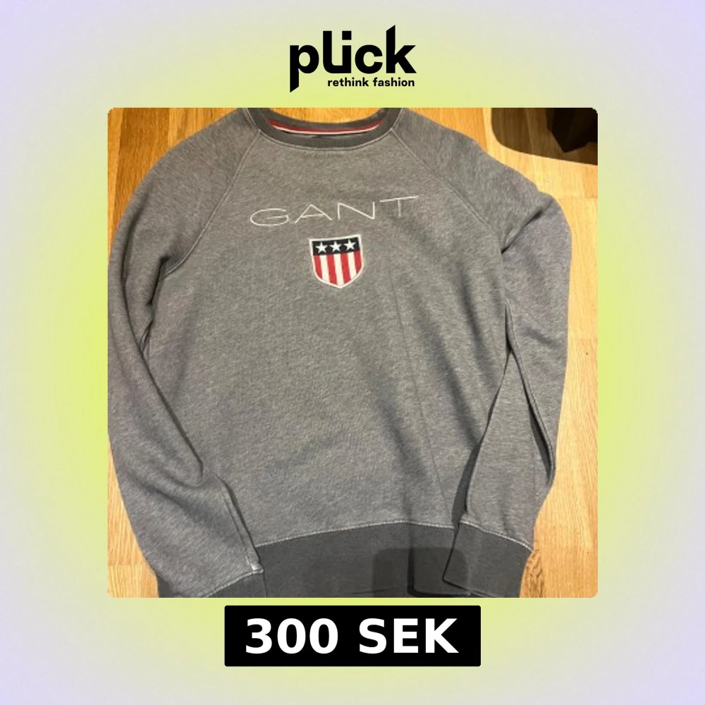 Säljer en grå sweatshirt från GANT med broderad logga och sköld på bröstet. Tröjan har rund halsringning och ribbade muddar vid ärmslut och nederkant. Perfekt för en avslappnad och stilren look.