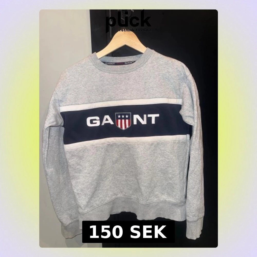 Snygg grå sweatshirt från Gant med bred mörkblå rand och vit kant över bröstet. Stor GANT-logga och sköld framtill. Klassisk rund hals och långa ärmar. Perfekt för en chill och sportig look.