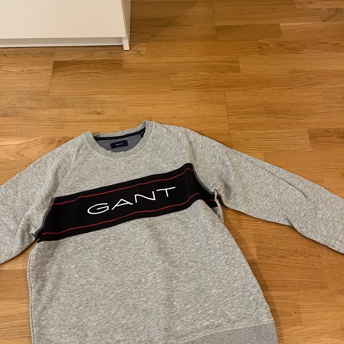 Snygg grå sweatshirt från GANT med svart och röd rand över bröstet och stor vit logga. Tröjan har rund hals, långa ärmar och är tillverkad i mjuk bomullsmix. Perfekt för en avslappnad och stilren look.