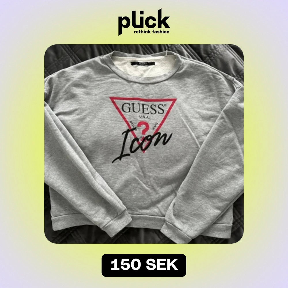 Snygg grå sweatshirt från Guess med deras ikoniska logga i rött och svart på framsidan. Tröjan har långa ärmar och en cropped passform. Använd några få gånger, därmed i mycket god skick.