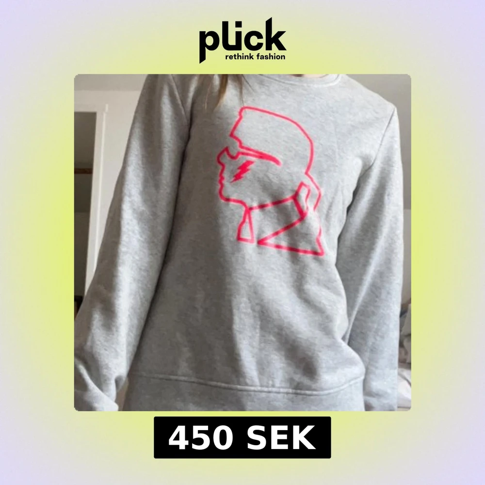 Säljer en grå sweatshirt från Karl Lagerfeld med ett stort rosa tryck av Karl Lagerfelds profil på bröstet. Tröjan har rund halsringning och långa ärmar. Perfekt för en cool och avslappnad stil.