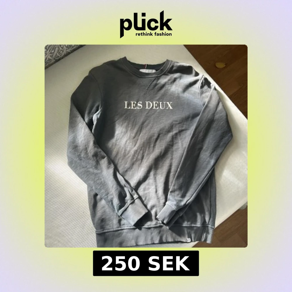 Säljer en stilren grå sweatshirt från Les Deux med vit text på bröstet. Tröjan har rund halsringning, ribbade muddar och är långärmad. Perfekt för en clean och avslappnad look. Materialet är mjuk bomull som känns skönt mot huden.