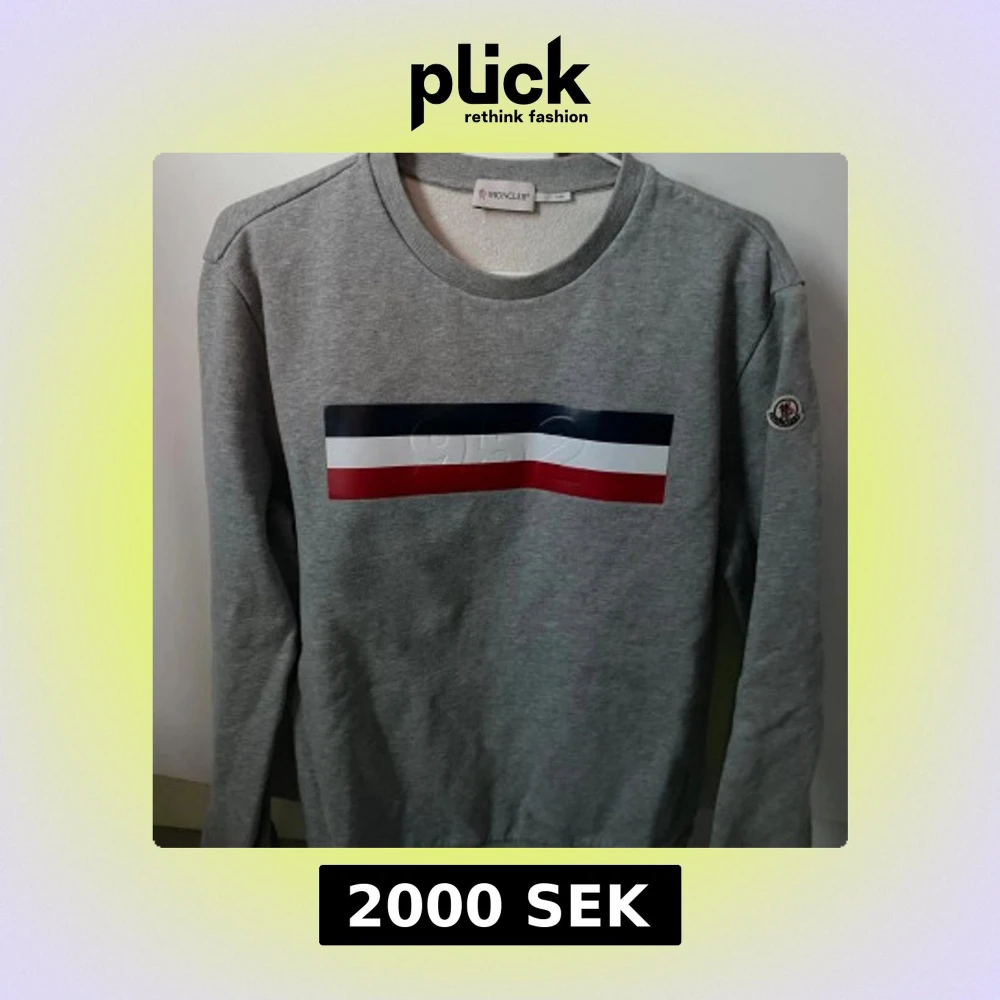 Säljer en stilren grå sweatshirt från Moncler med ett färgglatt band i blått, vitt och rött på bröstet. Tröjan har långa ärmar och rund halsringning. Köptes i New York och blev för liten snabbt, så väldigt oanvänd!
