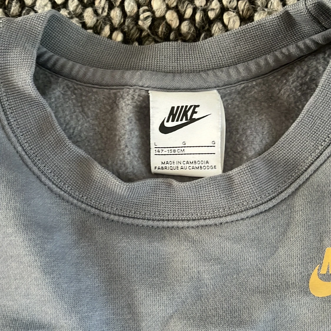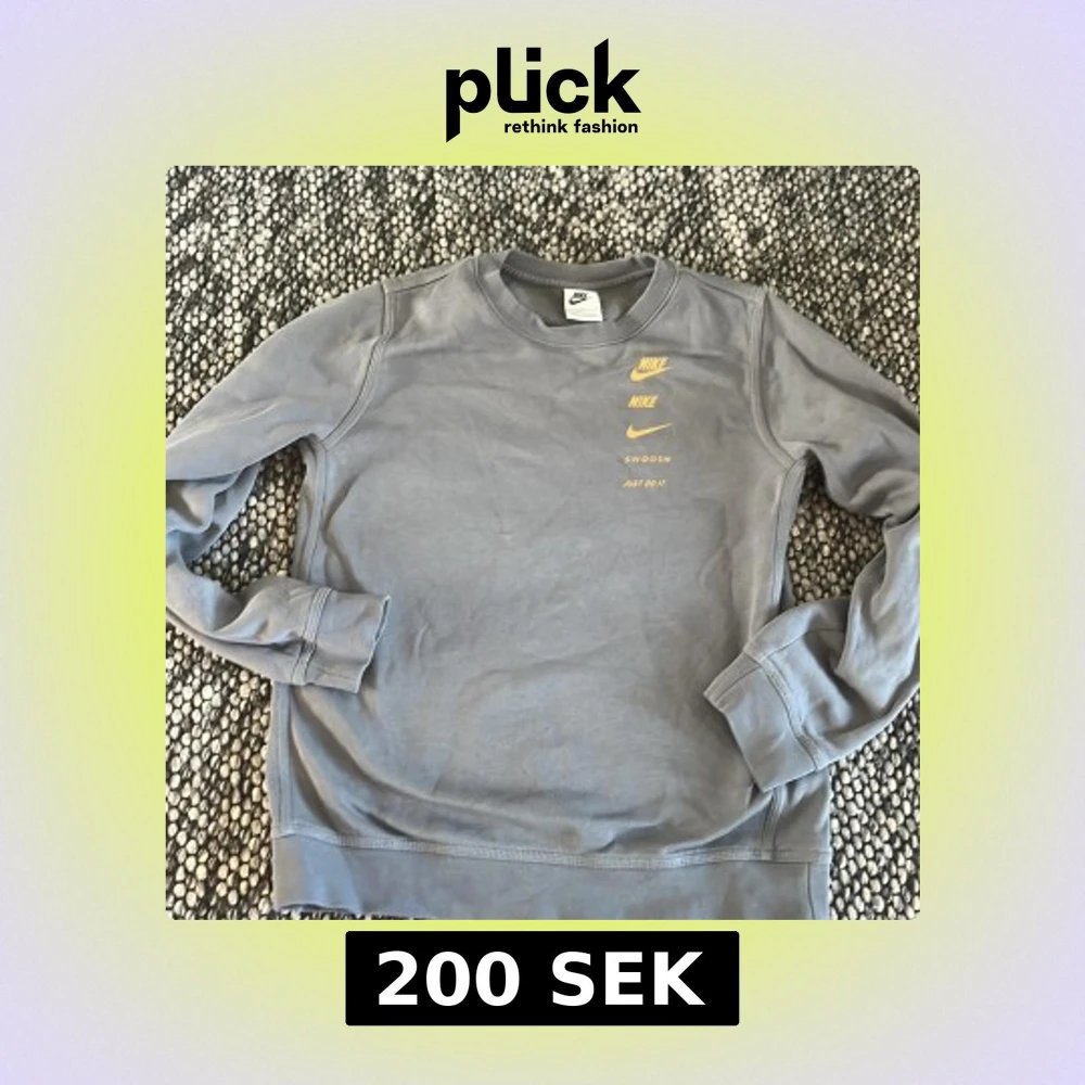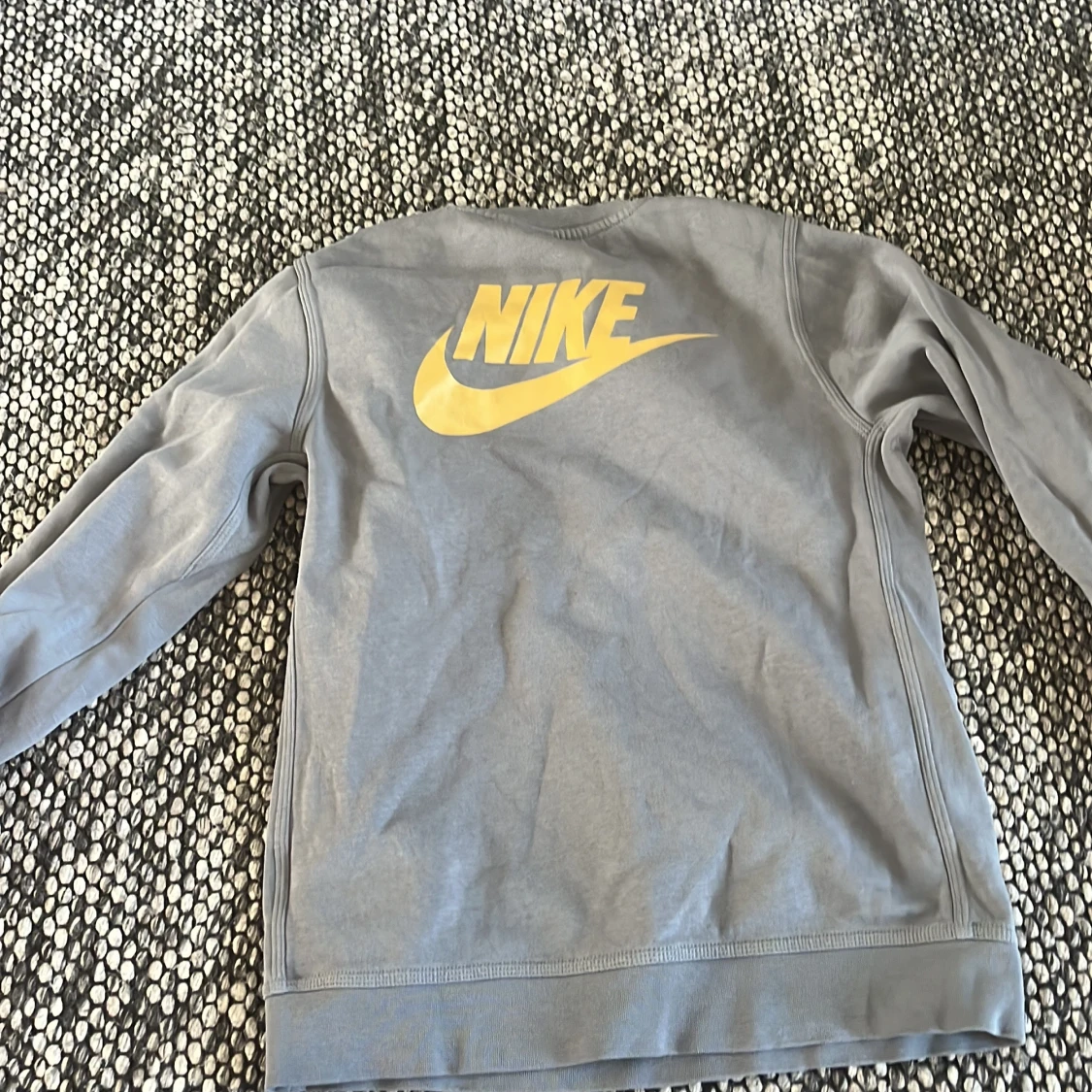 Säljer en grå sweatshirt från Nike och text på bröstet samt stor Nike-logga på ryggen. Tröjan har rund hals och långa ärmar. Perfekt för en sportig och avslappnad stil.