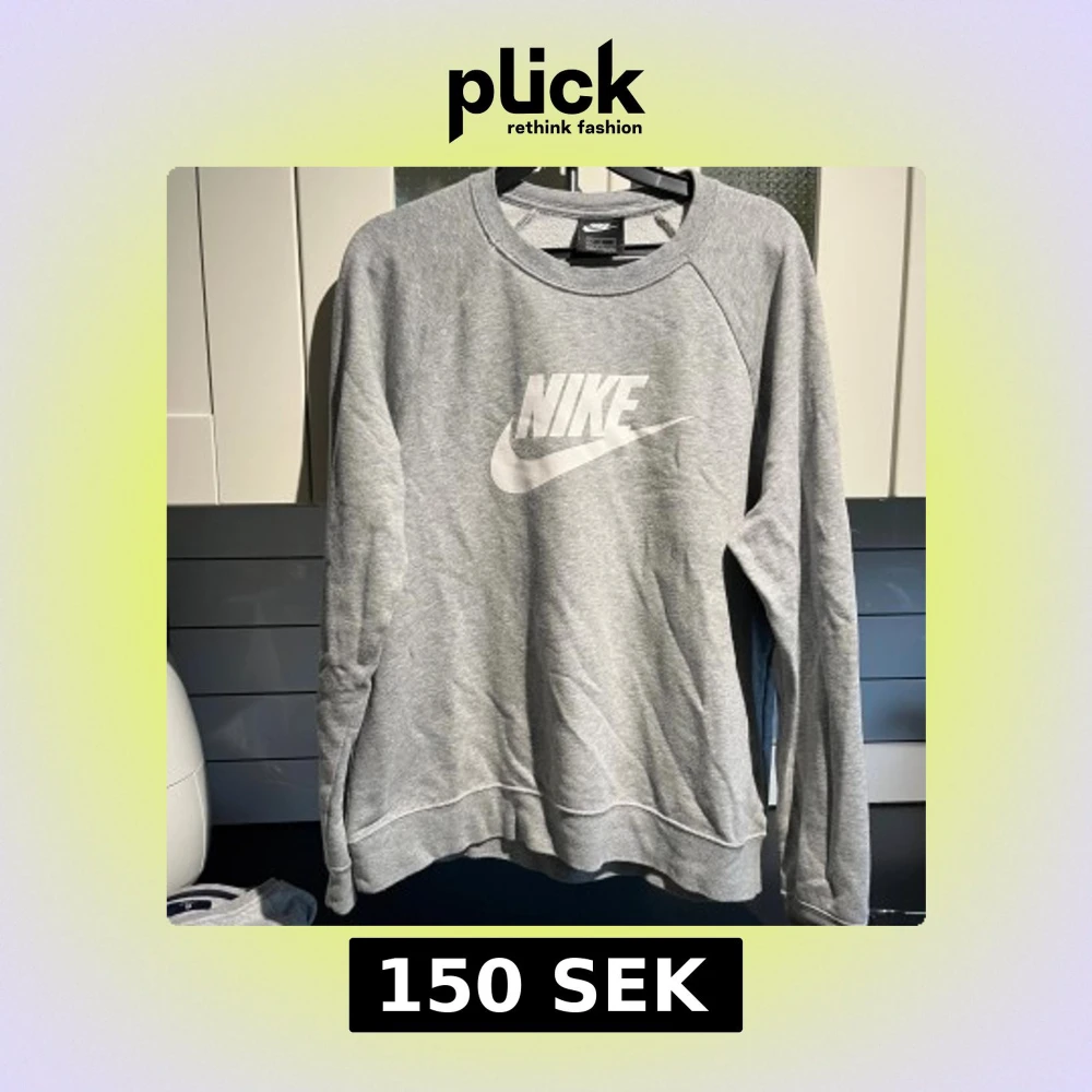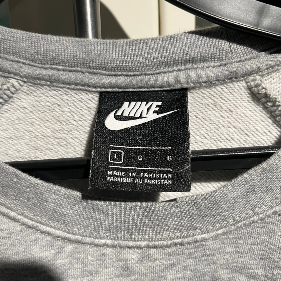Snygg grå sweatshirt från Nike i storlek L med klassisk vit Nike-logga på bröstet. Tröjan har rund hals, långa ärmar och är gjord i mjuk bomullsmix som är perfekt för chill eller träning. Enkel och stilren design som funkar till jeans eller joggers.