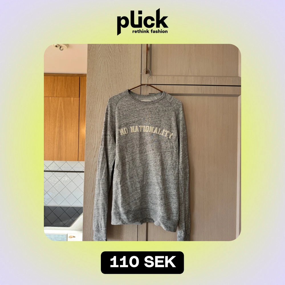 Säljer en snygg grå sweatshirt från NN07 med texten 'No Nationality' tryckt på framsidan. Tröjan är i storlek S och är tillverkad av 60% bomull och 40% polyester, vilket gör den både bekväm och hållbar. Perfekt för en avslappnad stil!