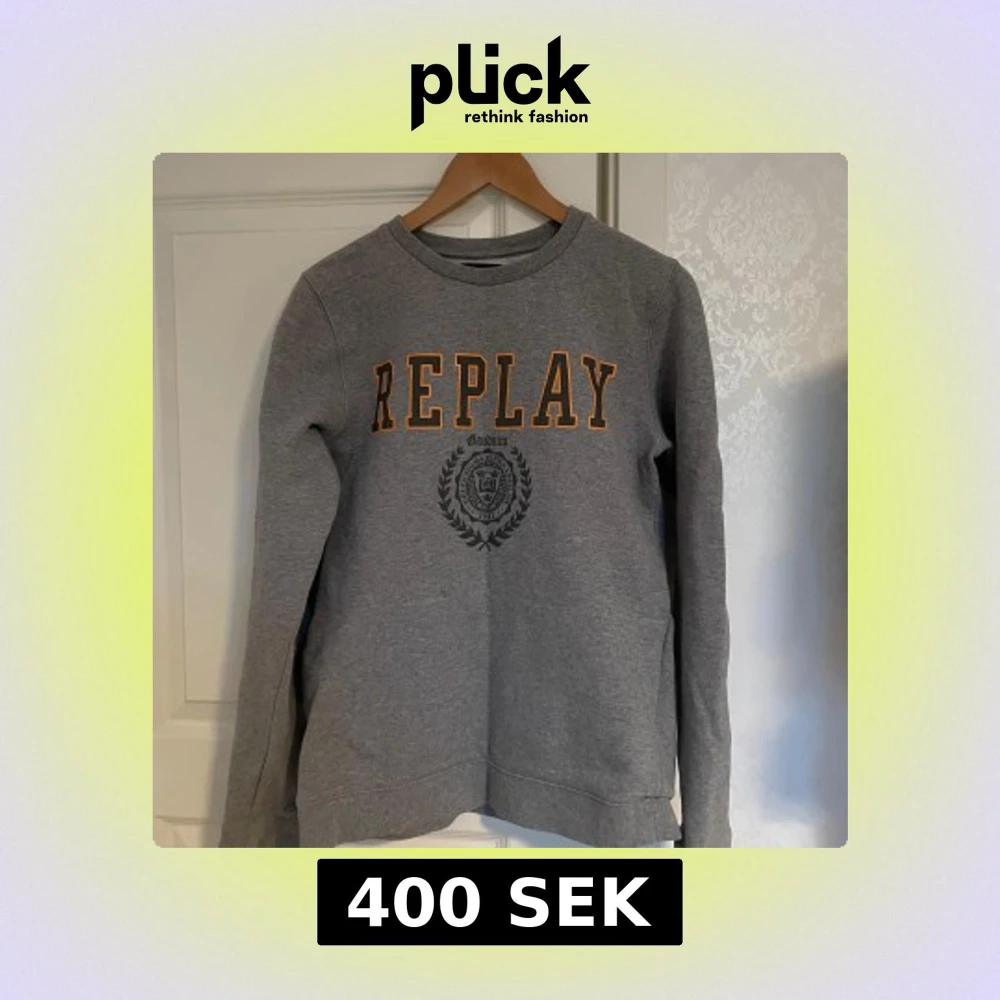 Säljer en grå sweatshirt från Replay med tryckt logga och emblem på bröstet. Perfekt för en stilren look. Storlek M säljer för 400kr men pris kan diskuteras vid snabb affär. Tröjan går inte att beställa längre och den är knappt använd.