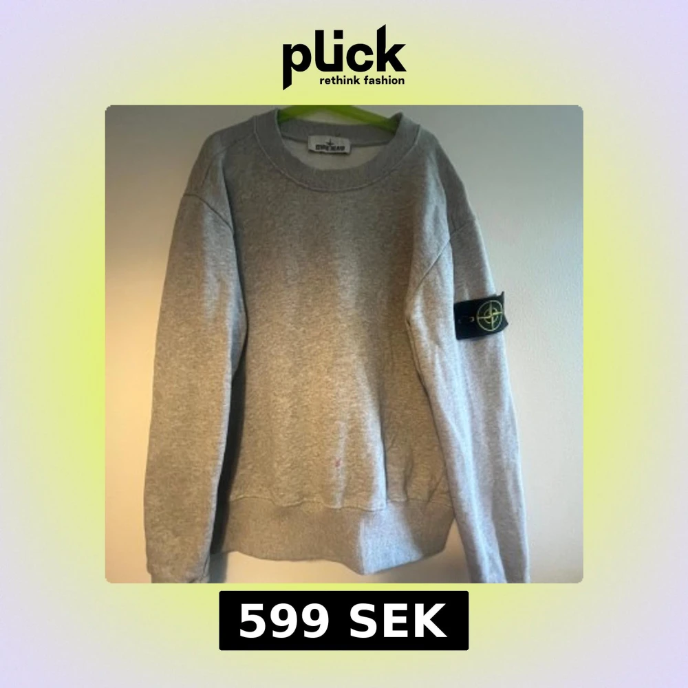 Säljer en klassisk grå sweatshirt från Stone Island med rund hals och den ikoniska loggan på vänster ärm. Tröjan är i mjuk bomull och har ribbade muddar vid ärmslut och nederkant. Perfekt för en avslappnad stil.