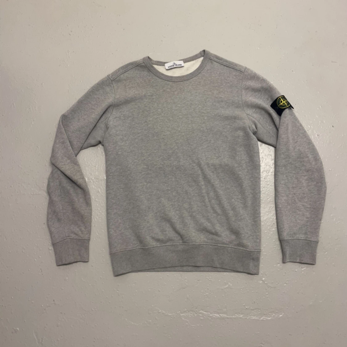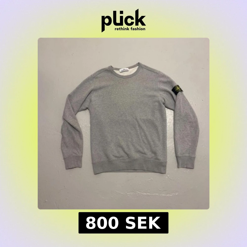Säljer en grå sweatshirt från Stone Island med klassisk patch på vänster ärm. Tröjan har rund halsringning och långa ärmar. Tillverkad i mjuk bomull.
