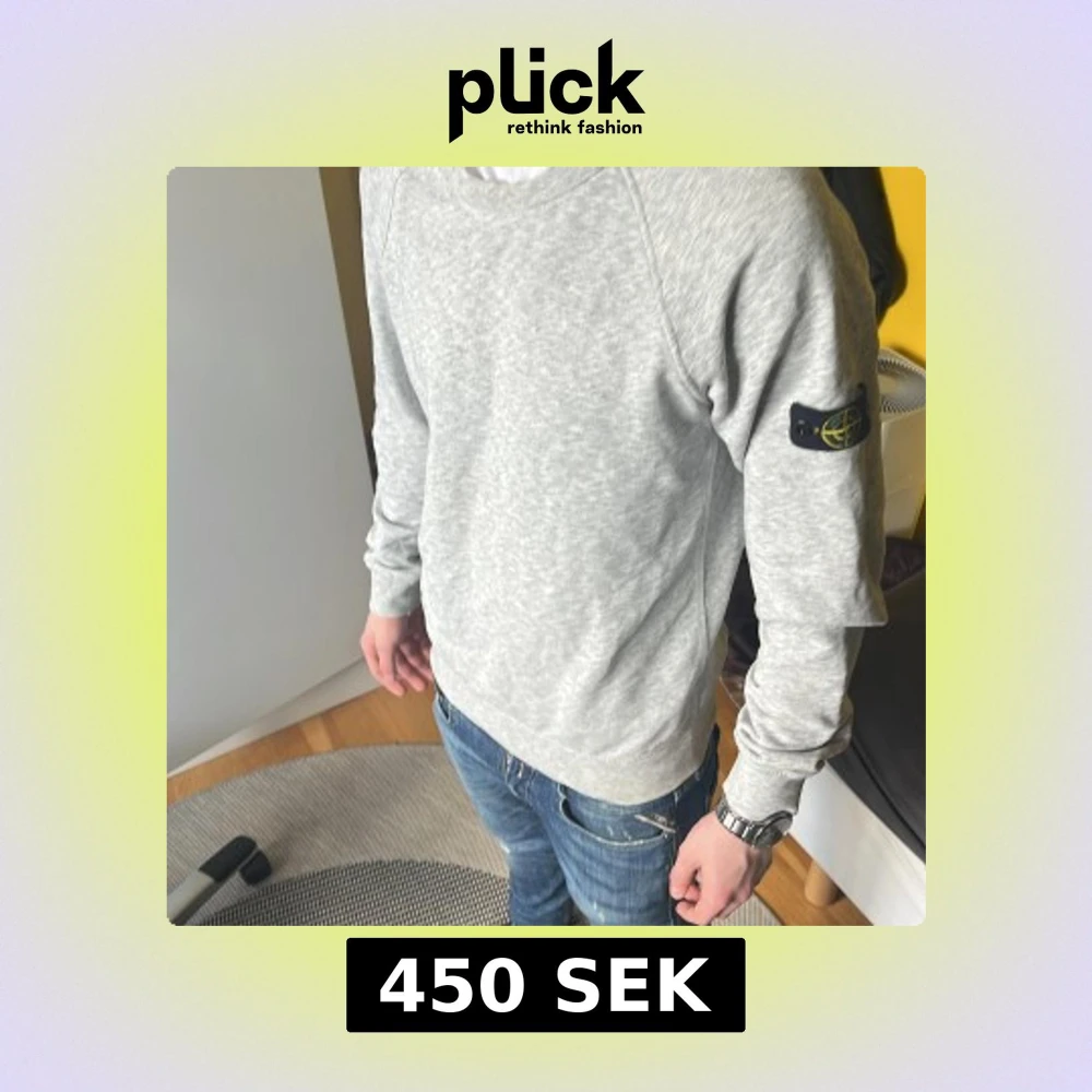 Säljer en stilren grå sweatshirt från Stone Island. Tröjan har långa ärmar och en rund halsringning. Den är tillverkad i ett mjukt material och har en ikonisk logga på ärmen. Perfekt för en avslappnad stil.