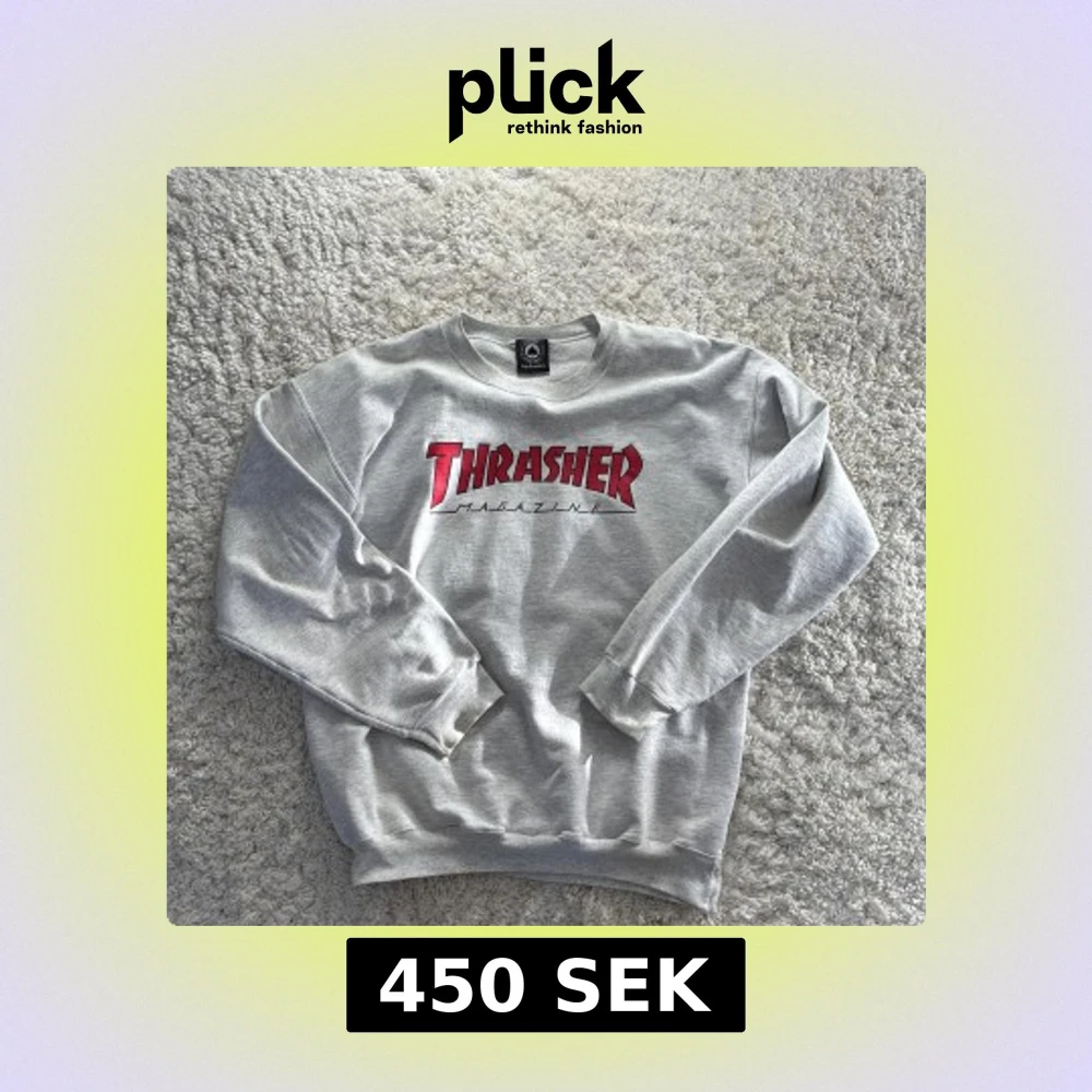 Säljer en grå sweatshirt från Thrasher med det ikoniska logotyptrycket på framsidan. Tröjan är tillverkad i en mjuk bomullsblandning och har långa ärmar med ribbade muddar. Perfekt för en avslappnad stil. Använd en del men har fortfarande fint skick.
