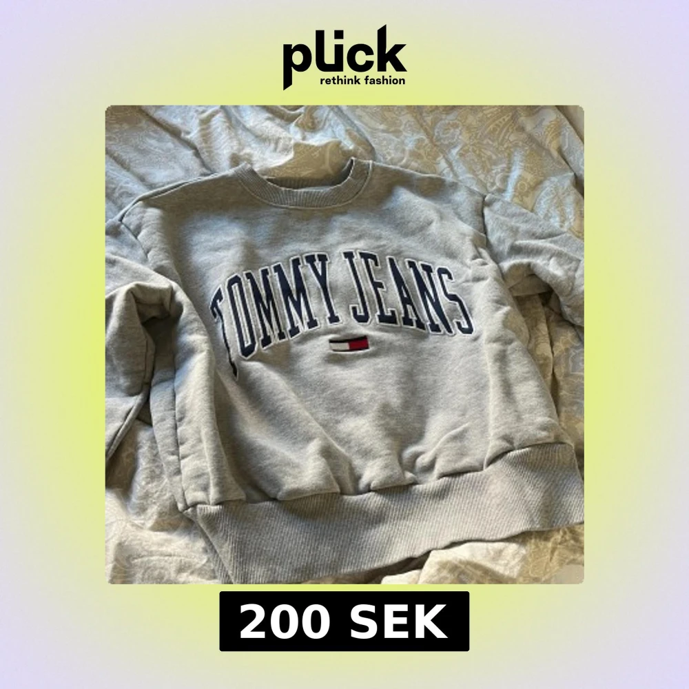Säljer en grå sweatshirt från Tommy Jeans med deras ikoniska logga i blått och vitt på framsidan. Tröjan har ribbade muddar vid ärmslut och nederkant. Använd men fortfarande i nyskick