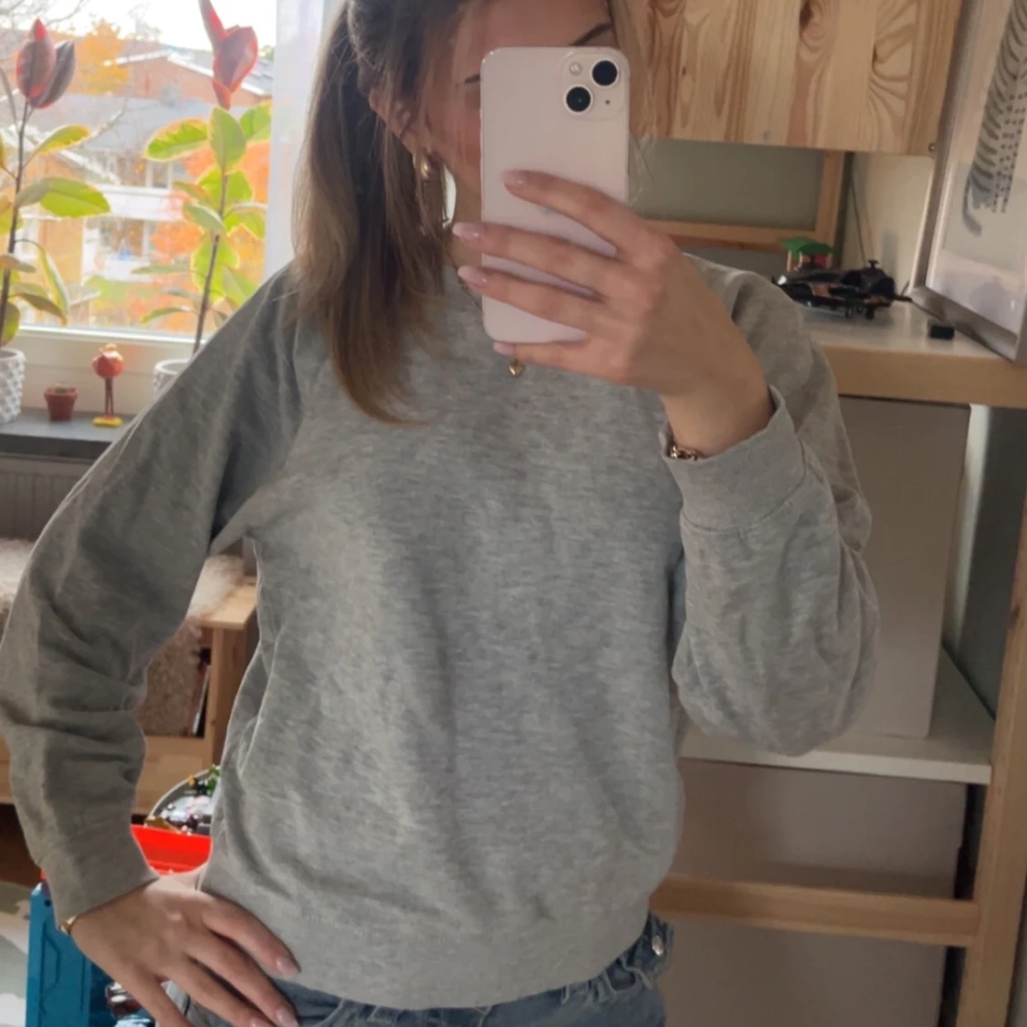 En enkel och stilren grå sweatshirt med rund hals och ribbade muddar vid ärmslut och nederkant. Tröjan är långärmad och har en normal passform, perfekt att matcha med jeans.