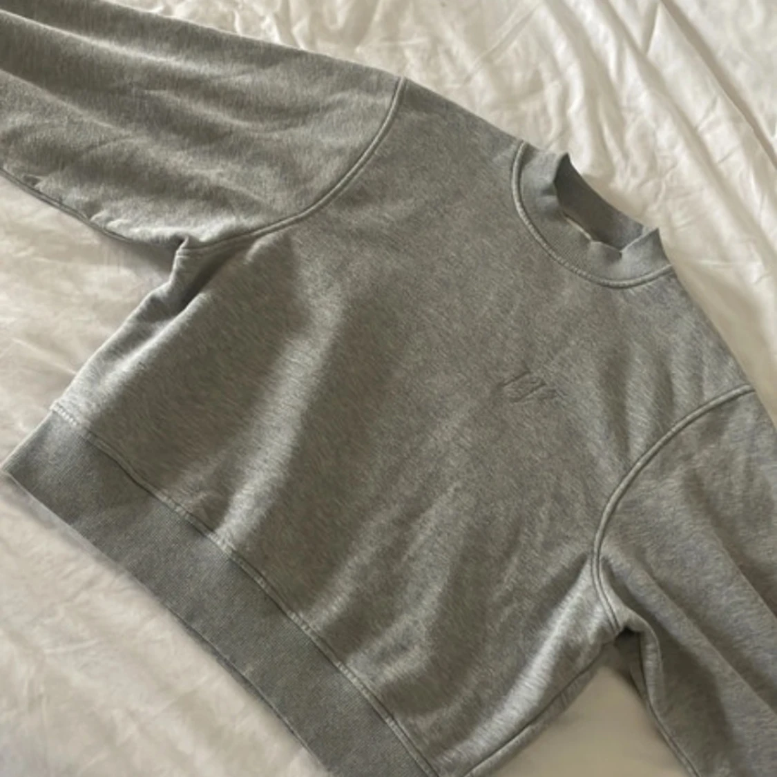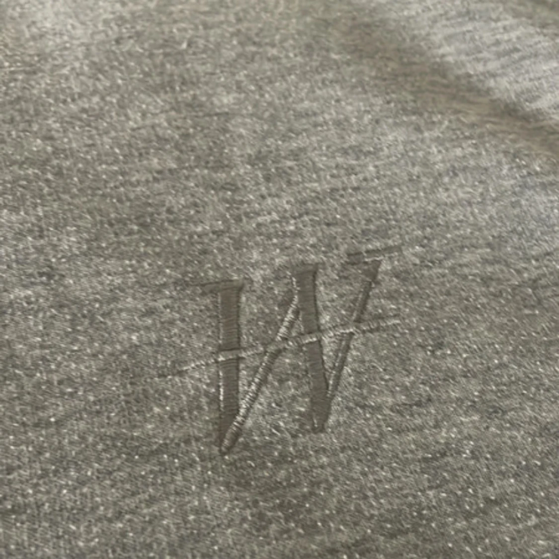 Säljer en stilren grå sweatshirt från JW med broderad logga på bröstet. Tröjan har rund halsringning, långa ärmar och breda muddar vid ärmslut och nederkant. Perfekt för en chill och avslappnad look.